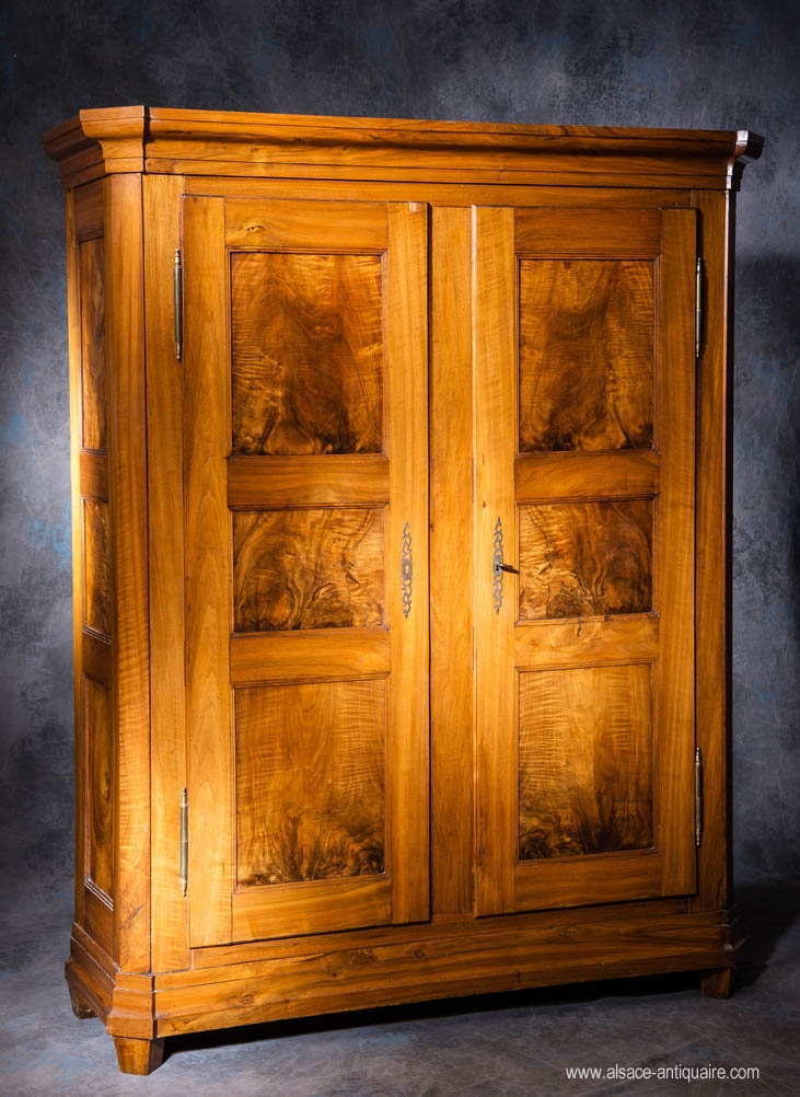 Armoire aux lignes sobres mais architecturées, en noyer blond, dont le choix des planches respecte la technique "miroir", les bois sont symétriques d'une porte par rapport à l'autre. Les gonds sont en laiton, et l'assemblage du meuble est à clavettes, système caractéristique des méthodes de fabrication dans nos régions, facile et fiable dans dans le temps. Époque XIX ème siècle, Noyer, fonds et planchers sapin. Alsace.