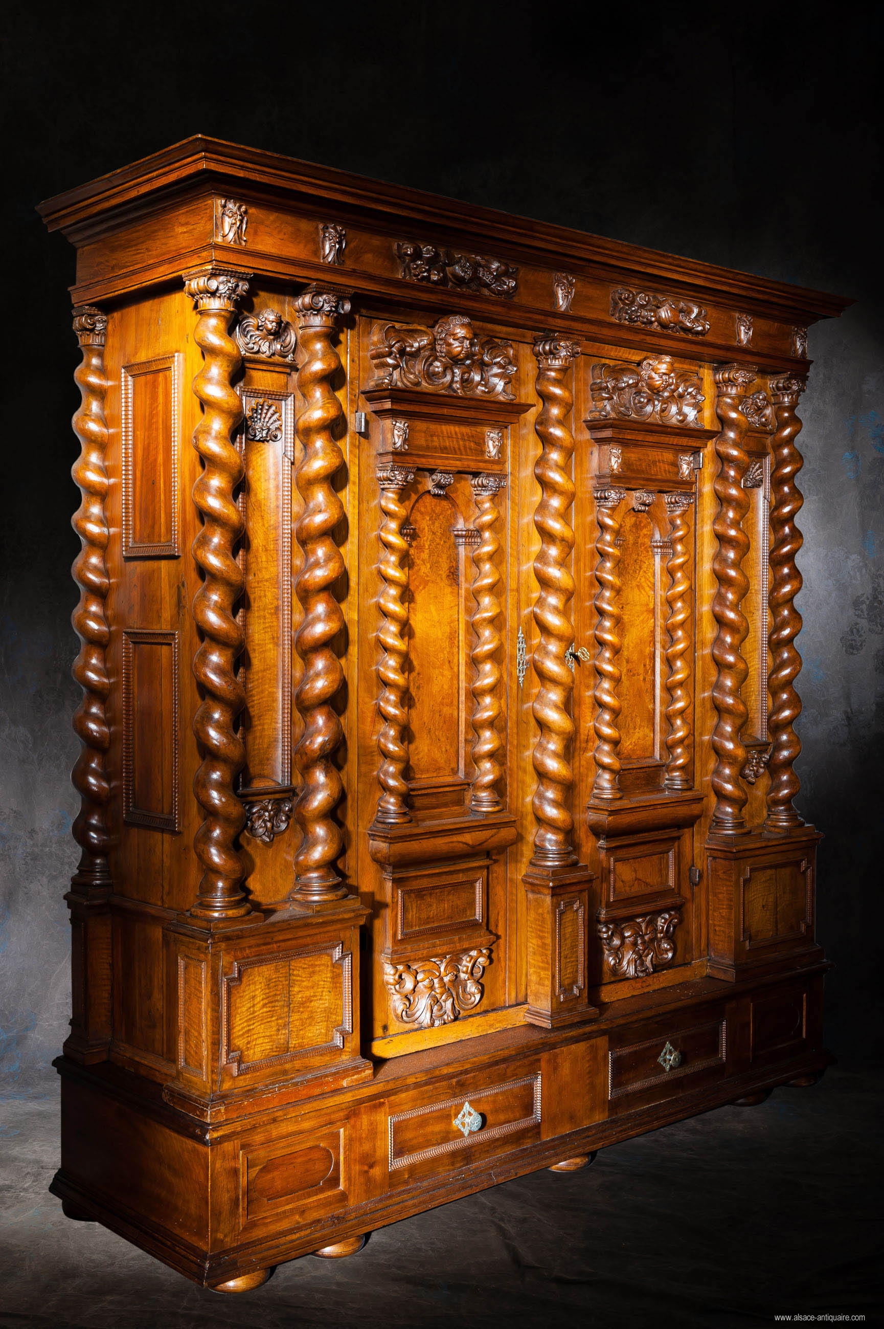 Exceptionnelle armoire, dont la façade est rythmée de 9 colonnes torses auxquelles s'ajoutent les 2 colonnes latérales engagées sur les angles arrières du corps central.D'un seul ton de bois, le bâti est recouvert de noyer, alternant un veinage ronceux pour les fenêtres avec un bois de fil pour les encadrements.Les colonnes sont coiffées de chapiteaux ioniques à la base desquels le maître à intercalé des motifs d'amortissement sur le thème des grotesques. Il faut remarquer la rare qualité des sculptures qui agrémente l'architecture de ce meuble alsacien ancien d'exception,dont un modèle similaire est reproduit planche CLI dans "l'art du meuble en Alsace", ouvrage de référence dans le domaine du mobilier alsacien, écrit par Françoise Levy-Coblentz et publié en 1975 chez Istra