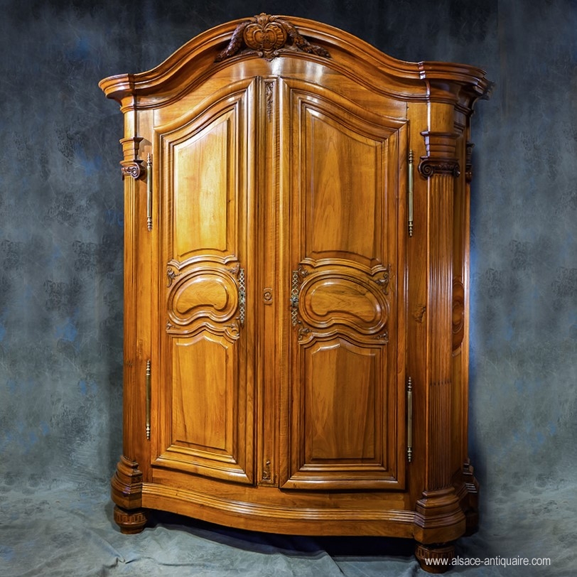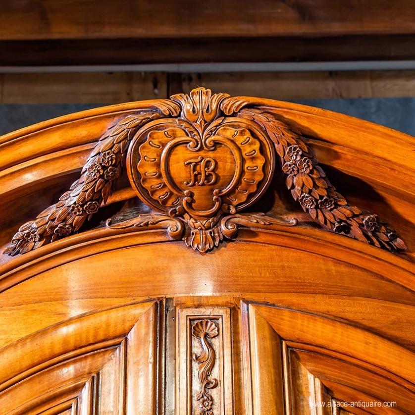 Exceptionnel qualité de noyer pour cette armoire chapeau de gendarme, galbée en façade et sur les cotés. Les larges pilastres d'angles à cannelures, coiffés de chapiteaux ioniques, rappellent le dessin des chefs d'œuvres de maitrise diffusés au 18 ème siècle par la corporation des menuisiers français de Strasbourg. Le fronton est coiffé d'un cartouche flanqué de guirlandes de laurier, au centre duquel un médaillon aux bords ourlés tel une coquille et au centre duquel sont sculptées des initiales, probablement celles du commanditaire. Le motif des portes est à rognons, les raccords d'angles sont finement sculptés de feuillages perlés, le montant central est sculpté d'une coquille et de rinceaux fleuris . Les cotés sont panneautés , au centre un médaillon ovale. Les pieds sont de forme toupie, typiques du style Louis XVI strasbourgeois. Belle crémone et serrure d'époque. Alsace Strasbourg Epoque XVIII ème siècle .