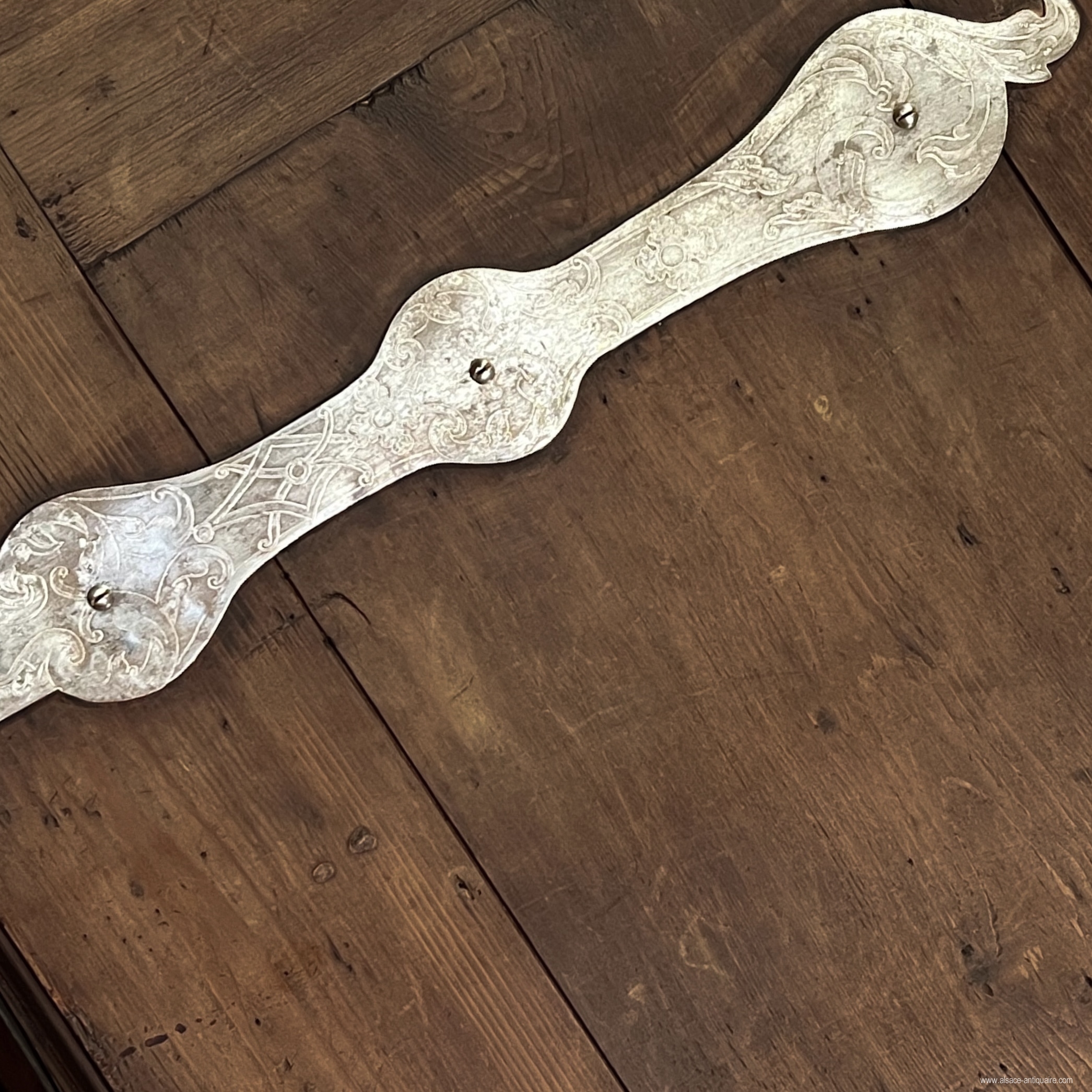 Les entrées de serrure sont en laiton, décor de feuilles au repoussé, et l’ouverture des portes laisse découvrir une magnifique serrure et des pentures d’époque en fer gravé de rinceaux et feuillages, la clef, également ancienne, est surmontée d’un cœur sur le haut de l’anneau, peut-être s’agit il d’une armoire de mariage.