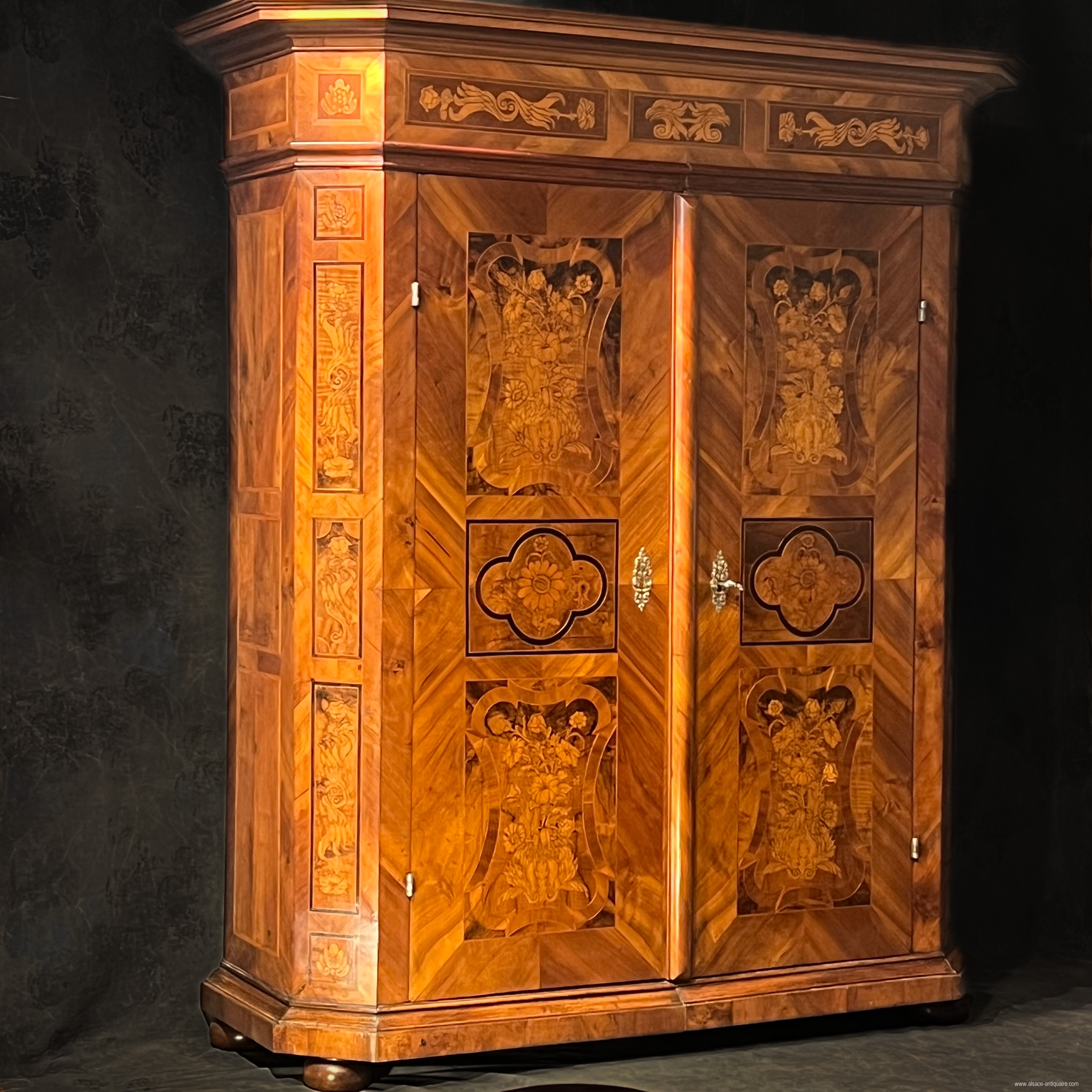 Belle armoire d’apparat, ce meuble est habillé de larges frisages de noyer contournés de filets alternants bois clair, de l’érable, et foncé, du cormier, enserrant des réserves marquetées de chutes de fleurs et de feuillages sur les pilastres d’angle et le bandeau supérieur. Au centre de la corniche, un cartouche marqueté d’un aigle à deux têtes, emblème couramment utilisé en héraldique par les nobles familles de l’empire des Habsbourg d’Autriche dès la fin du XVI ème siècle . Les portes sont divisées en 3 panneaux, dont le médian présente une réserve quadrilobée comportant une fleur insérée dans chaque quart, celle au départ du lobe inférieur se développe au centre en un large bouton ouvert. De part et d’autre de cet axe médian 4 panneaux symétriques délimitent, par un large filet au contour chantourné, un espace tel une plate bande simulée, habillé d’une large composition florale aux tiges multiples.