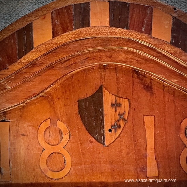 Ce cadre de calendrier est beau témoin d’art populaire, réalisé en fruitier avec incrustations de motifs marquetés de frises géométriques, il comporte une date 1818. Son fronton est en chapeau de gendarme, il est coiffé de trois bobèches en fruitier et comporte en son centre un blason armoirié.