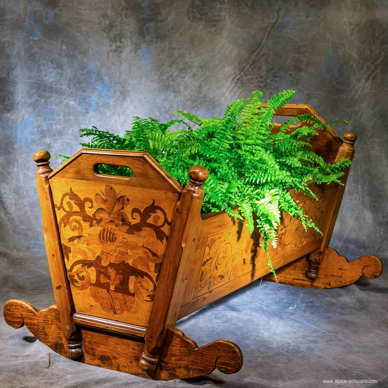 Rare berceau en noyer marqueté sur toutes ses faces. Décor de rinceaux floraux sur les panneaux latéraux , sur une des faces, des Initiales, de part et d'autre d'un amour, surplombant un écu, probablement des armoiries, au centre duquel un arbre stylisé. Sur l'autre face un décor de feuillages cernent un haume ou casque, et laisse supposer une famille issue de la noblesse ou de la chevalerie. Les essences utilisées pour les motifs marquetés sont des bois de pays, érable et fruitiers. Le berceau a été équipé postérieurement d'un bac pour plantes réalise en cuivre. Bel et rare objet de décoration , probablement d'origine suisse et d'époque XVIII ème