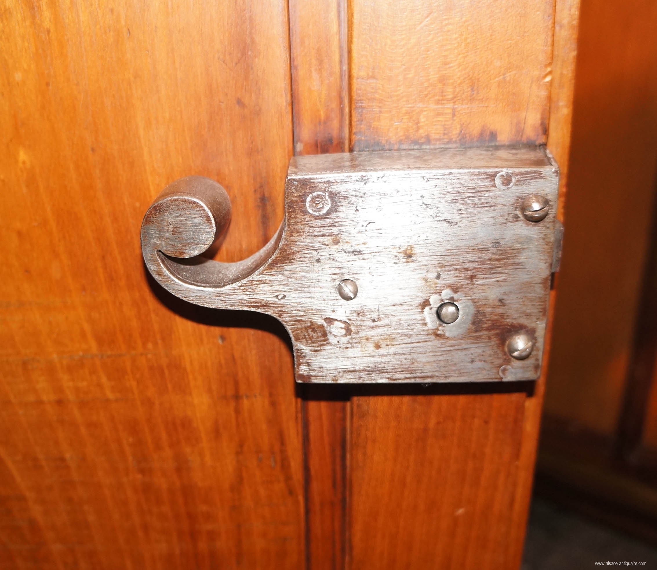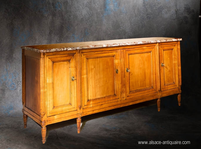 Buffet Louis XVI ou enfilade 4 portes, montants à cannelures, bois fruitier et dessus marbre brun rouge, le marbre présente une ancienne restauration.la porte de gauche dissimule une série de tiroirs pour les couverts.Belles serrures en fer. Epoque fin XVIII ème début XIX ème.