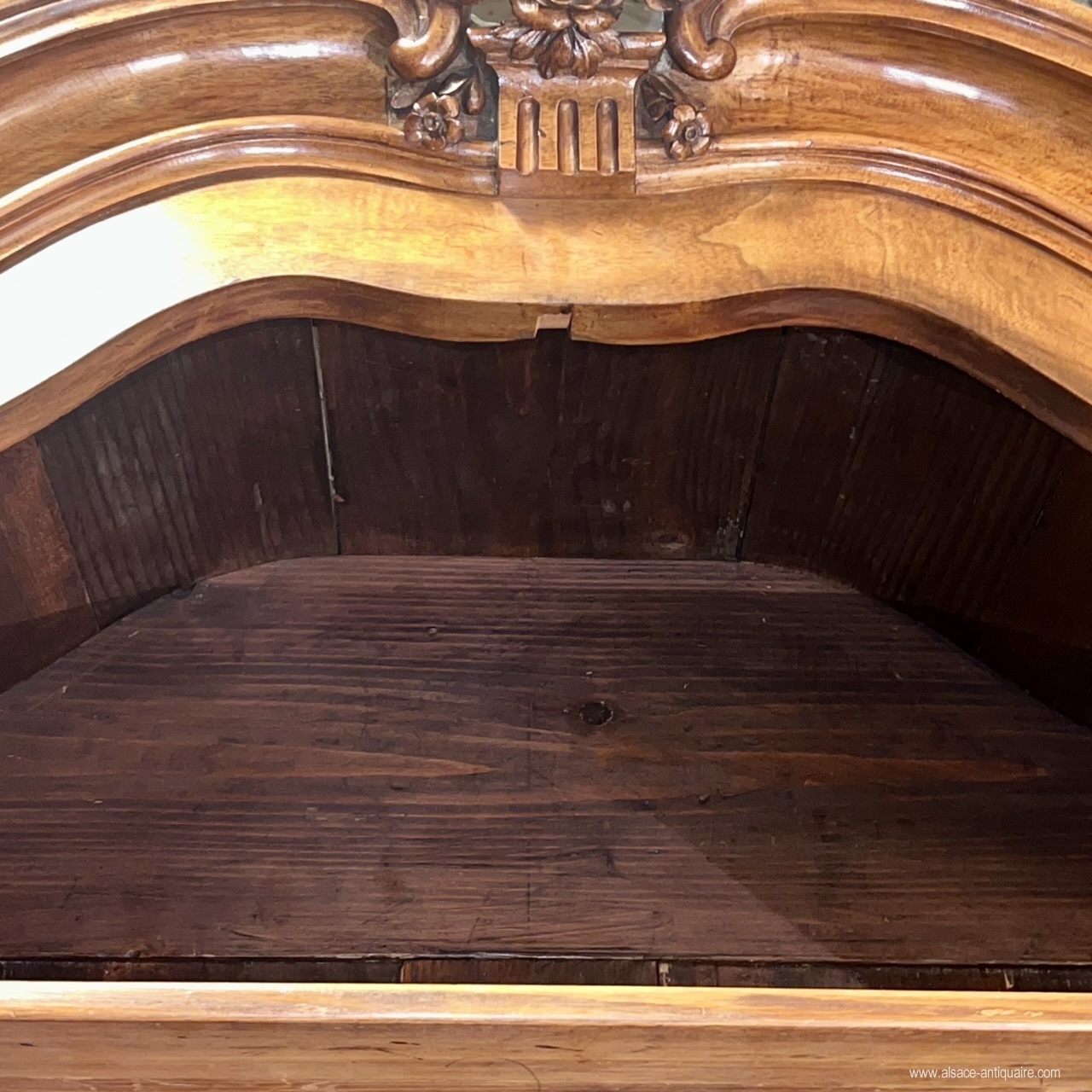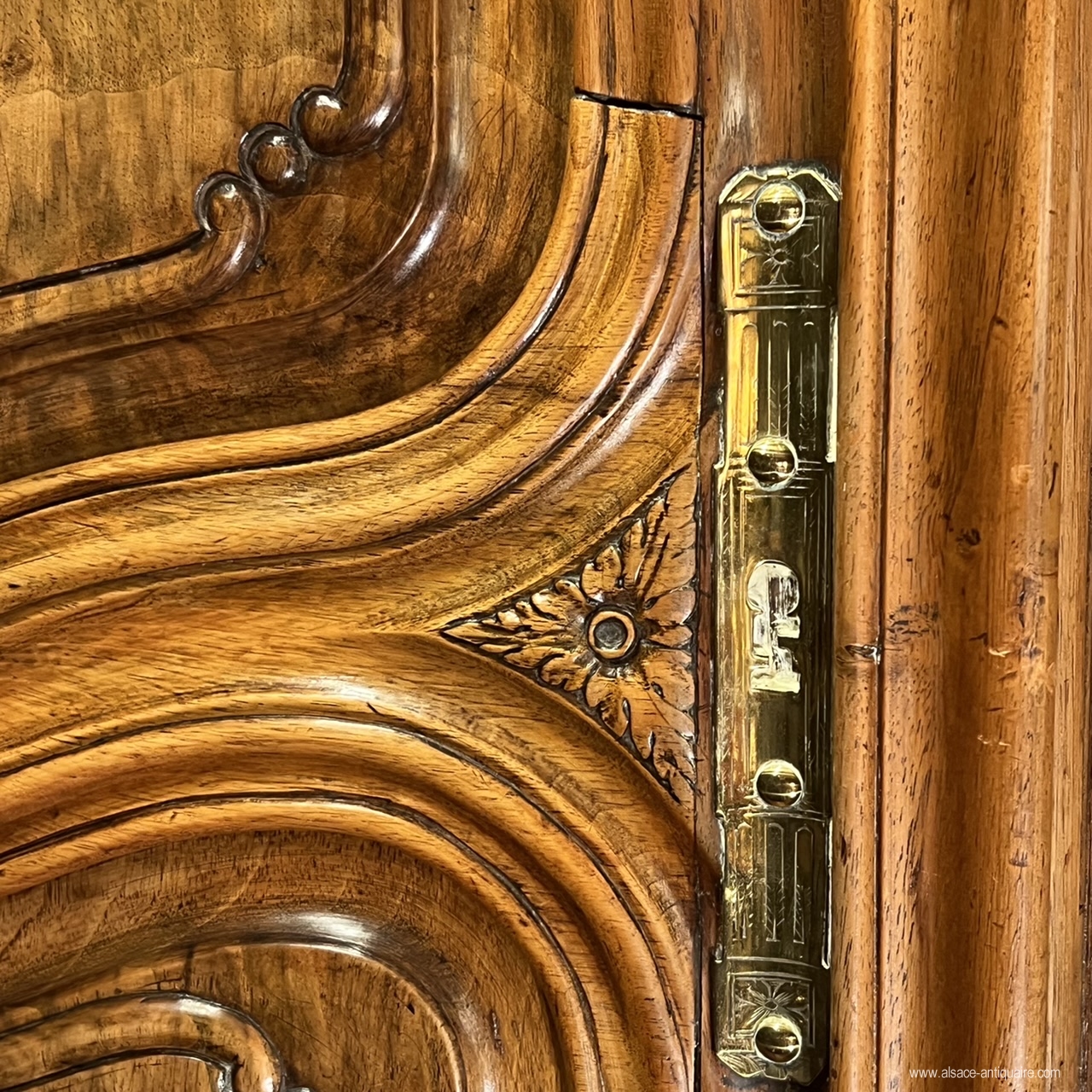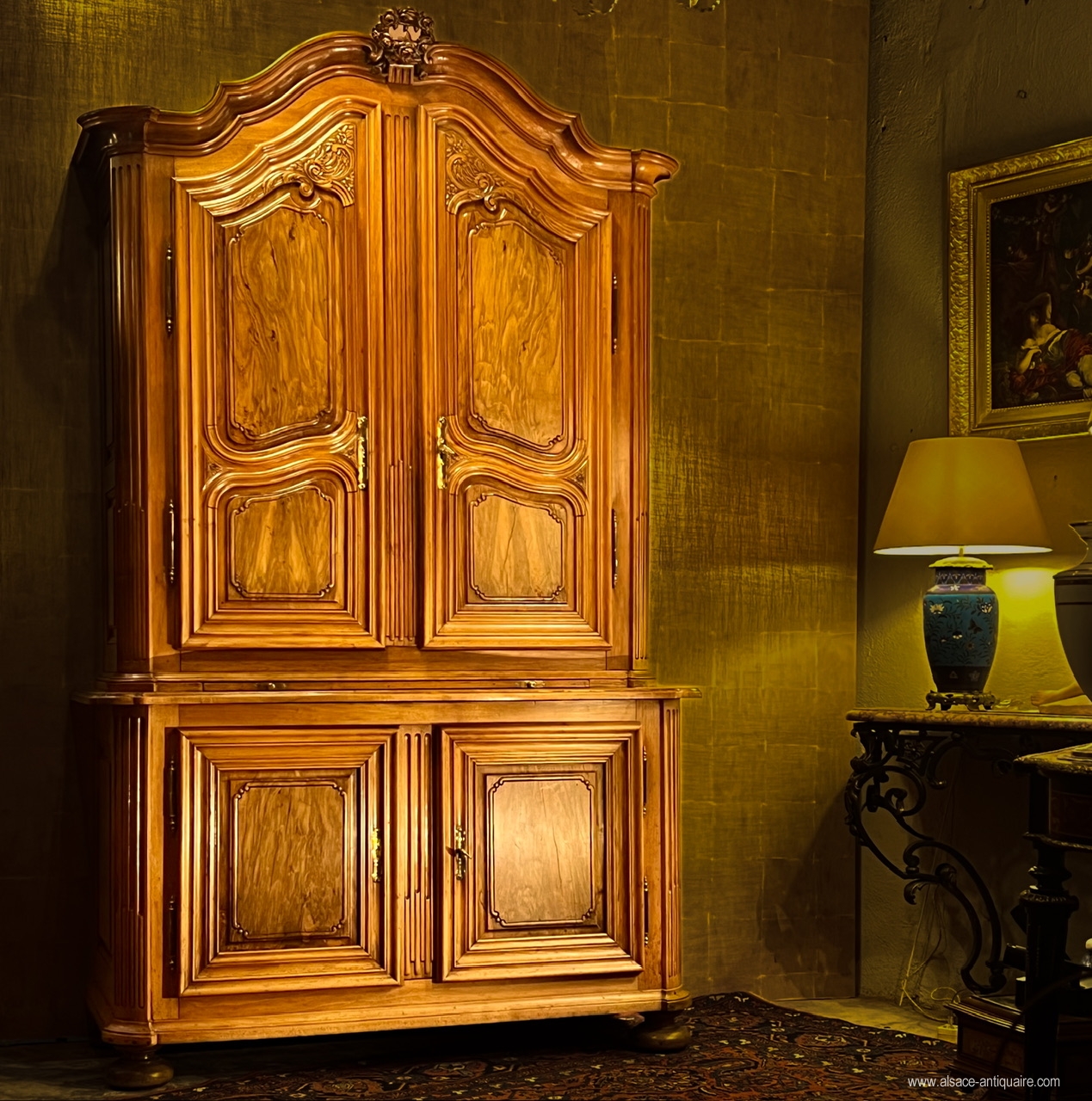 Beau noyer blond pour ce meuble alsacien, dont la corniche, très caractéristique de cette région, est dite en « chapeau de gendarme ». Le dessin d’ensemble et des détails, les proportions , le choix du noyer, la haute qualité d’exécution et de sculpture permettent d’attribuer la fabrication de ce beau meuble aux ateliers strasbourgeois du XVIII ème siècle. Ce buffet est bien architecturé avec ses montants à pilastres arrondis structurés par un jeu de cannelures à chandelles, le haut des portes du corps supérieur est sculpté de rinceaux, feuillages et volute, les angles des panneaux de portes sont également agrémentés de petites volutes, les entrées de serrure sont en laiton gravé de motifs néo classiques, la porte de gauche du corps supérieur présente une belle crémone en fer forgé avec pommeau en laiton. Le corps supérieur , dont le plafond intérieur est voûté, est démontable et assemblé par des clavettes en bois. . Meuble de collection, mais également meuble élégant, ce buffet pourra s’intégrer dans un intérieur contemporain ou rejoindre une ambiance plus classique. Très bel état . Alsace - Strasbourg Époque XVIIi ème siècle.