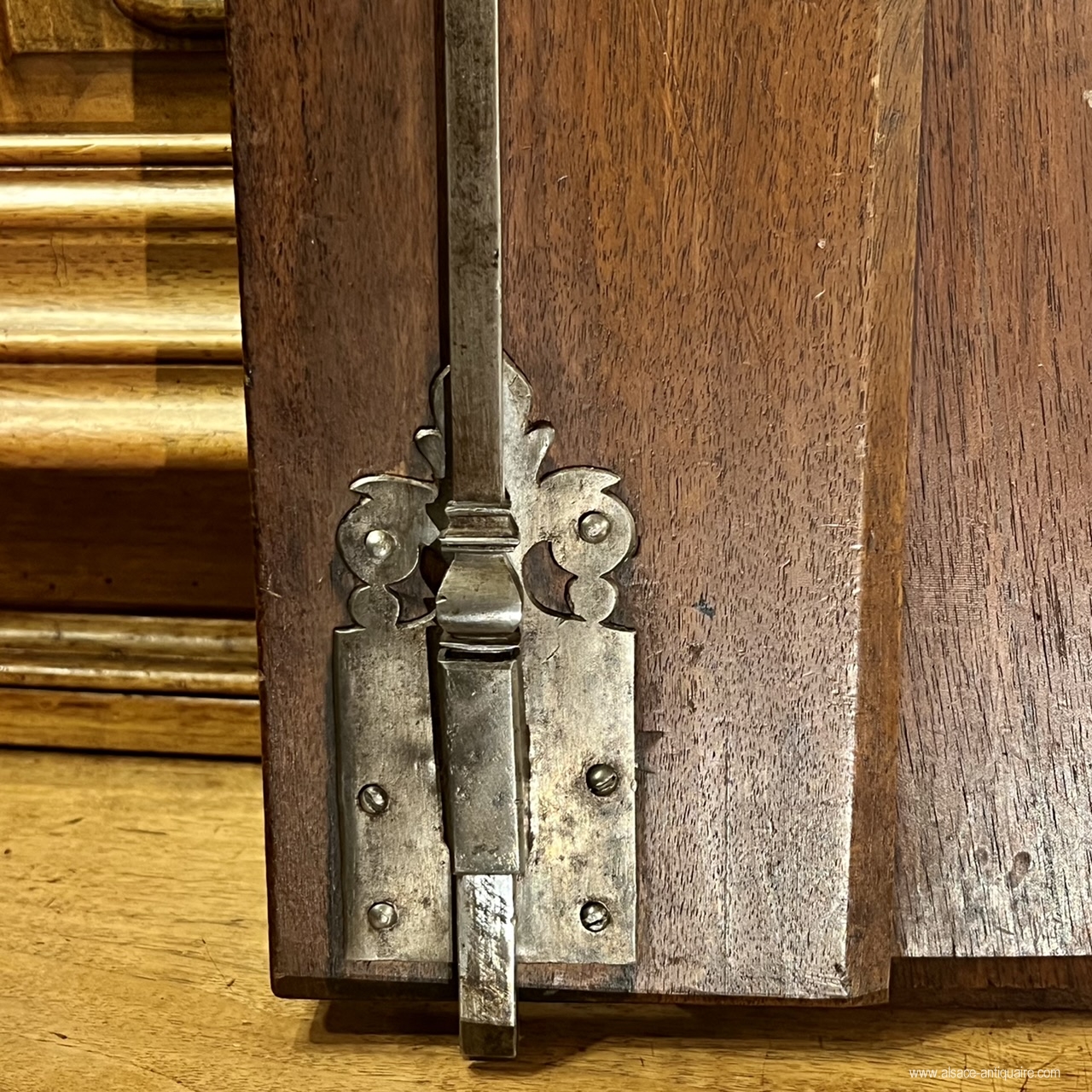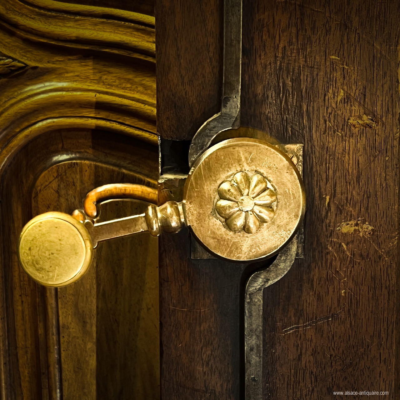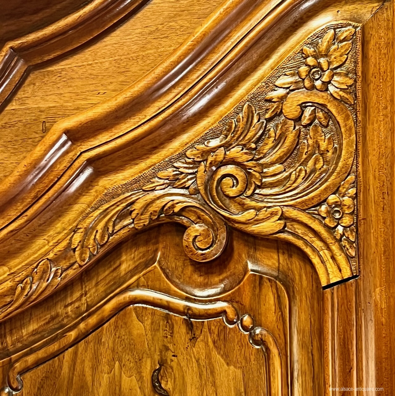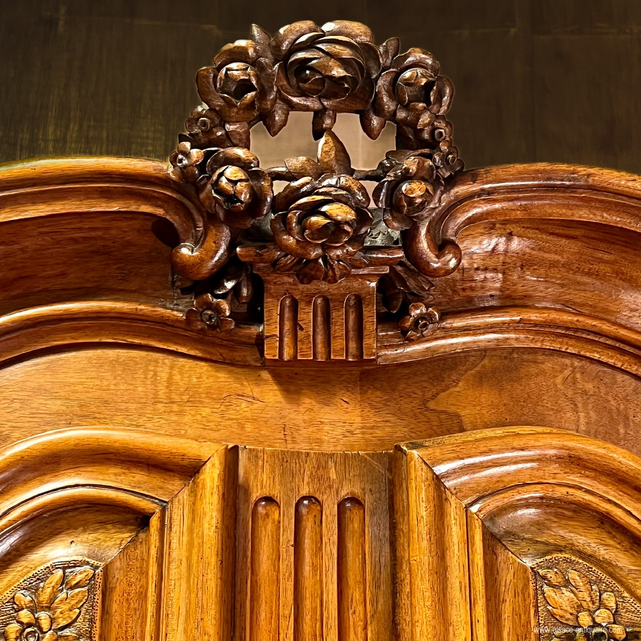 Beau noyer blond pour ce meuble alsacien, dont la corniche, très caractéristique de cette région, est dite en « chapeau de gendarme ». Le dessin d’ensemble et des détails, les proportions , le choix du noyer, la haute qualité d’exécution et de sculpture permettent d’attribuer la fabrication de ce beau meuble aux ateliers strasbourgeois du XVIII ème siècle. Ce buffet est bien architecturé avec ses montants à pilastres arrondis structurés par un jeu de cannelures à chandelles, le haut des portes du corps supérieur est sculpté de rinceaux, feuillages et volute, les angles des panneaux de portes sont également agrémentés de petites volutes, les entrées de serrure sont en laiton gravé de motifs néo classiques, la porte de gauche du corps supérieur présente une belle crémone en fer forgé avec pommeau en laiton. Le corps supérieur , dont le plafond intérieur est voûté, est démontable et assemblé par des clavettes en bois. . Meuble de collection, mais également meuble élégant, ce buffet pourra s’intégrer dans un intérieur contemporain ou rejoindre une ambiance plus classique. Très bel état . Alsace - Strasbourg Époque XVIIi ème siècle.
