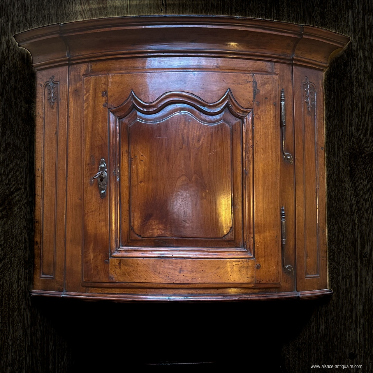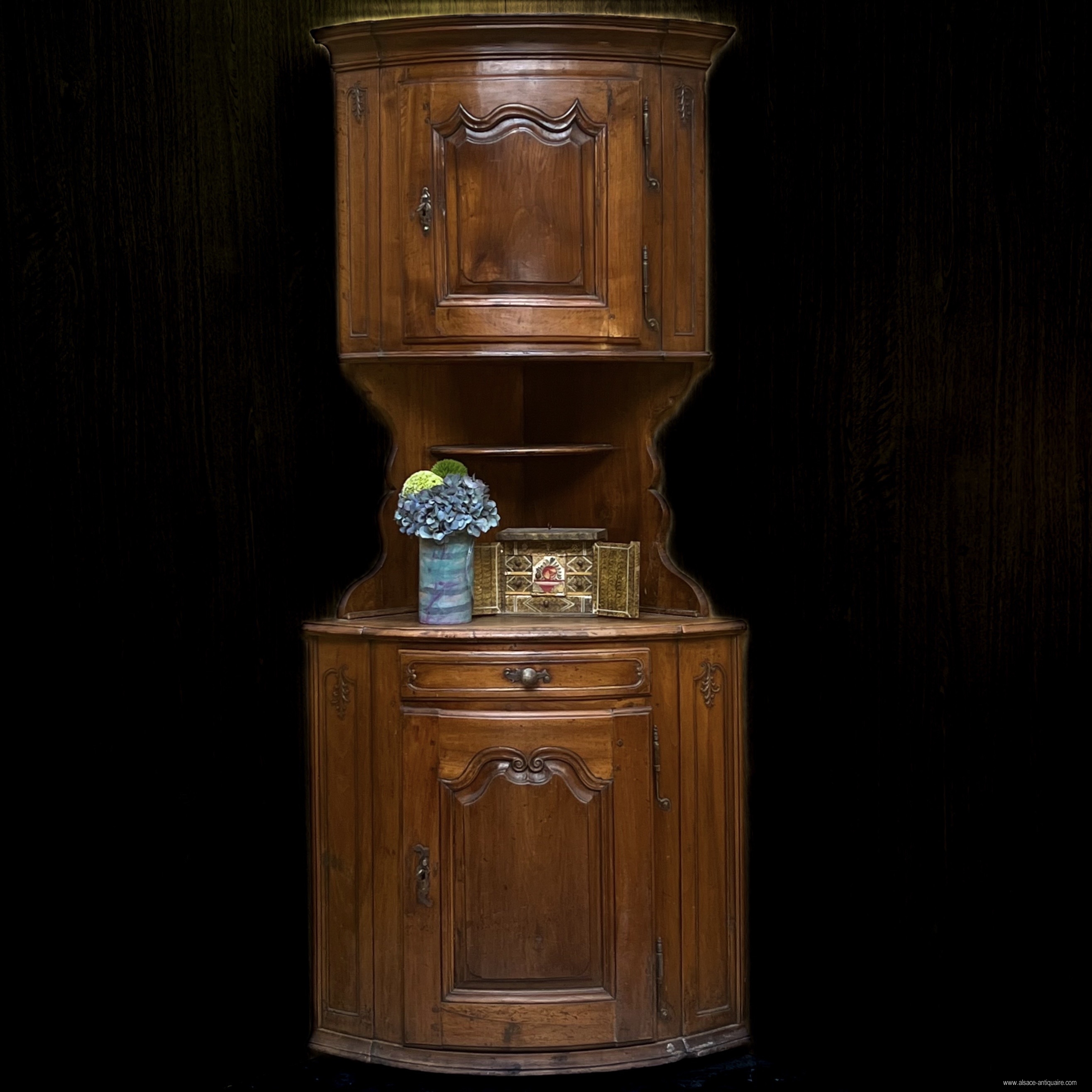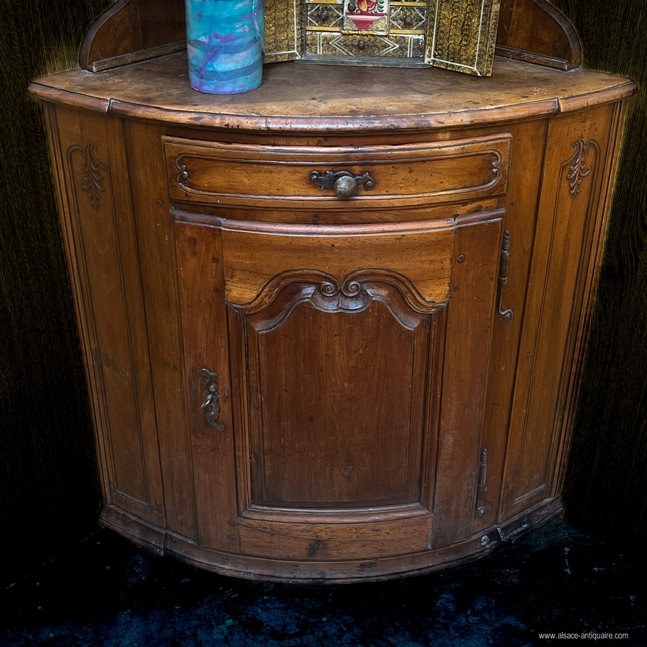 Rare encoignure alsacienne à deux corps, concept du buffet d’angle inspiré de l’ Olmer, un espace entre le corps du haut et du bas permettait d’y présenter les pichets d’étain et poteries. Les portes sont moulurées et sculptées de volutes, belles charnières d’origine en fer forgé dites à queues de cochon. Les montants sont également moulurés et sculptés en réserve de volutes et branchages. Beau meuble en noyer. Alsace époque XVIII ème .