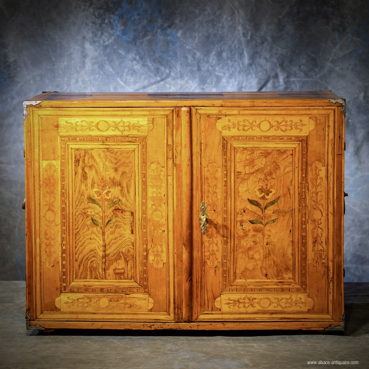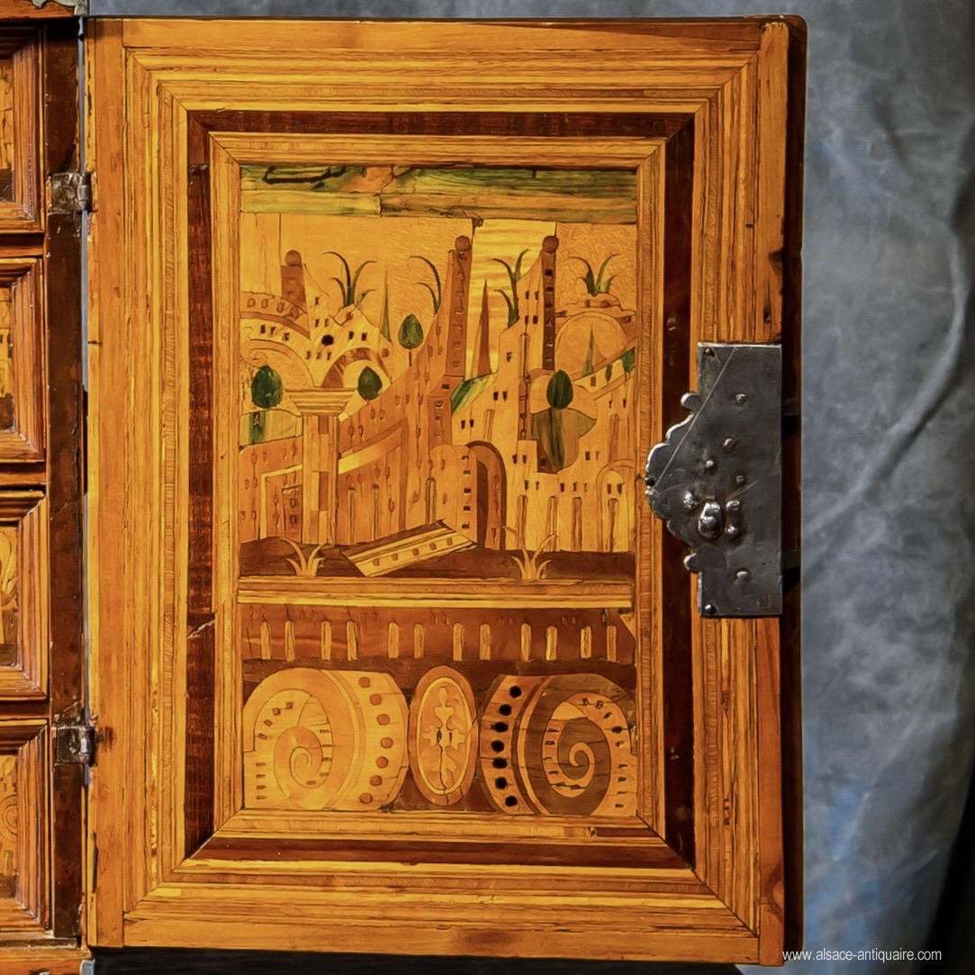 Ces cabinets , très en vogue sous la renaissance, complétaient bien souvent l’intérieur de châteaux forts d’Alsace et les propriétés des notables, les essences utilisées pour leur réalisations étaient similaires à celles figurant sur les pièces de mobilier alsacien produites au XVI ème et encore tout au long du XVII ème siècle, raisons pour lesquelles plusieurs cabinets approchant ce modèles, sont présents dans les collections des musées alsaciens, notamment au Musée Historique de Strasbourg, au Musée Alsacien de Strasbourg et même au Musée de Guebwiller.