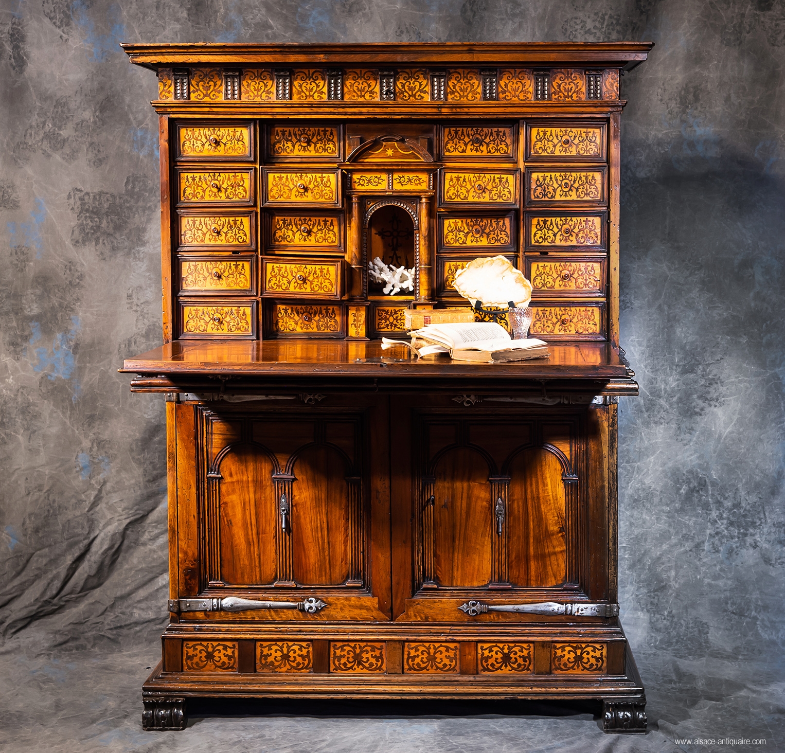 Ouvert il nous laisse découvrir un agencement avec de nombreux tiroirs et portillons revêtus du même motif de ferronnerie simulée que celui présent sur la corniche et le socle . Ce type de décor à également été utilisé en Alsace et en Suisse et nous saurons où nos ébénistes ont trouvé leur inspiration, nous pouvons citer à ce titre le remarquable dressoir d’époque renaissance, au decor marqueté d’architectures d’inspiration italienne, qui se trouve au musée historique de Mulhouse.