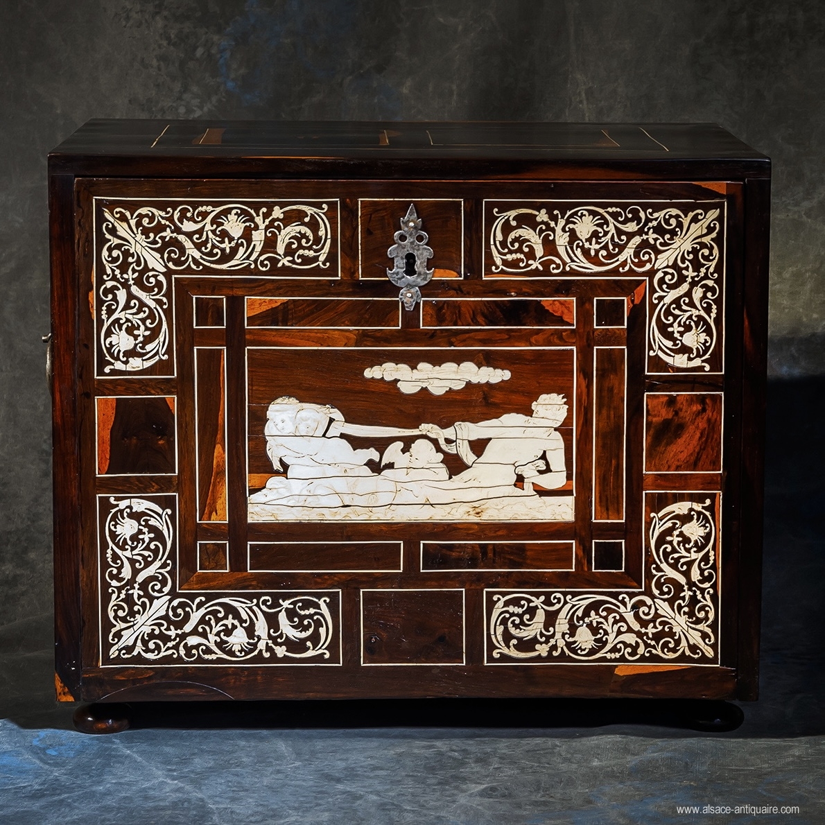 Travail Italien, probablement naples. Les artisans de cette ville se spécialisent dans les cabinets agrementés de fines plaques d'ivoire. La domination espagnole sur Naples permet à ce royaume d'acceder facilement au marché de l'ivoire depuis la reprise par les Habsbourg du Royaume du Portugal, qui detenait un quasi monopole sur le commerce de ce materiaux précieux et prisé. Poignées latérales en fer. Epoque XVIIe siècle. Petites restaurations anciennes, pieds boules et clef postérieurs.