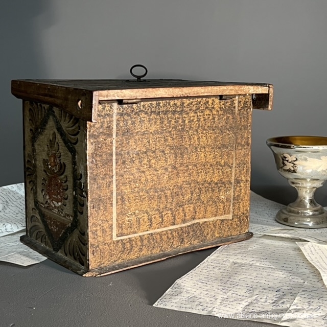 Coffret de courtoisie sur le modèle d'un petit cabinet, rare exemplaire d'art populaire, sud de l'Alsace ou Suisse , rappelons que notre ville de Mulhouse était une république indépendante sous protectorat suisse jusqu'à la fin du XVIII ème siècle et que le style du mobilier produit dans notre région se rapproche des arts décoratifs helvétiques .