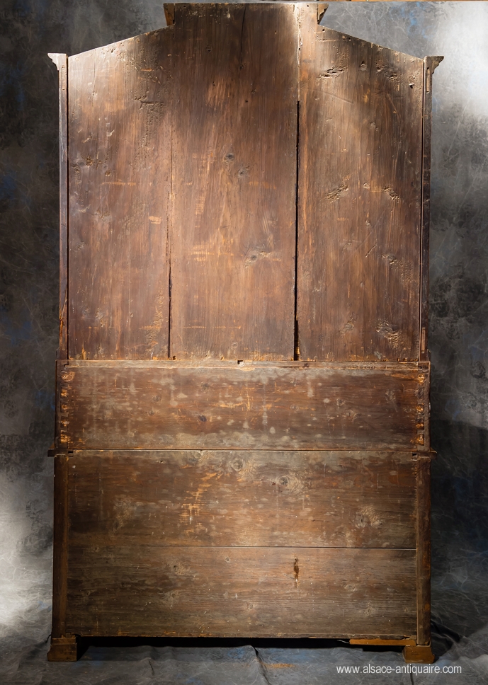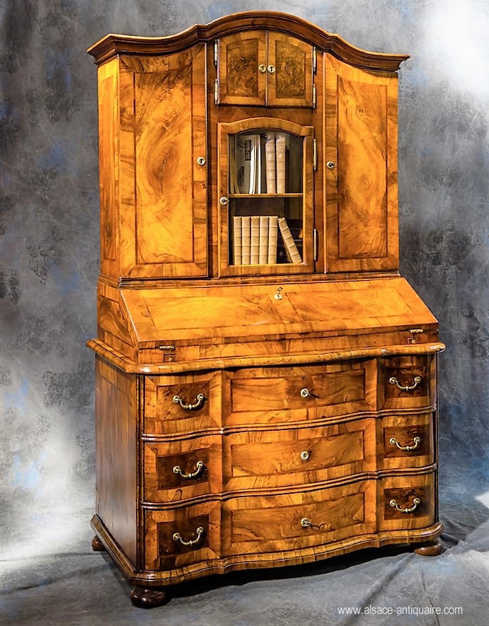 Cabinet Scriban réunissant plusieurs fonctions, commode dans la partie basse avec 3 tiroirs galbés en arbalète, secrétaire dans la partie médiane et cabinet pour le corps supérieur avec ses nombreux tiroirs dissimulés par la porte de droite, au centre une petite vitrine pour y presenter livres rares ou objets de collection surmontée d'un petit cabinet à deux portes. La corniche est en chapeau de gendarme, principe largement développé dans les regions du pays rhénan. Entièrement marqueté de noyer, alternant frisage en bois de fil réserves en noyer ronceux, larges filets contrastés en prunier. Le bord du plateau mouluré en bec de corbin est en bois de bout. Noyer, prunier, bâti en sapin. Sud de l’Alsace Sundgau, Suisse, Pays rhénans. Epoque 18 ème siècle