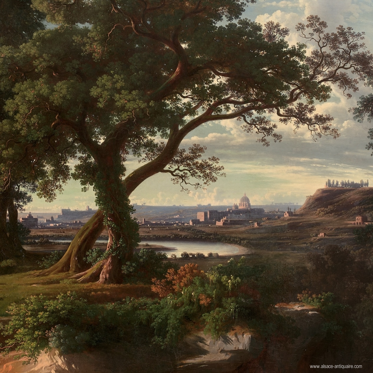 Johann Jakob Frey, est un artiste suisse né à Bâle en 1813. Il a débuté sa carrière en étant apprenti chez son père à Bâle, avant de s'installer à Paris. Grâce à une rencontre fortuite à Munich, il a pu visiter Rome en 1835 et se lier d'amitié avec des artistes renommés comme les peintres paysagistes Joseph Anton Koch et Johann Christian Reinhart. Il a également voyagé en Sicile, en Espagne et en Égypte pour documenter les paysages et l'architecture. De retour à Rome en 1843, il connaît rapidement un succès financier grâce aux commandes de monarchies et de riches mécènes. Frey a exécuté ce panorama élaboré de la plaine romaine avec ce focus sur le Vatican en 1859, il utilisait des techniques de composition uniques, comme jouer avec la lumière et les proportions, pour créer des effets dramatiques et donner une interprétation artistique des éléments architecturaux. Frey aura passé une partie importante de sa vie à Rome et décédera à Frascati en 1865. Ses œuvres sont présentes dans de nombreuses collections italiennes et suisse également dans des musées.