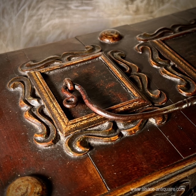 Ce rare coffret est la reprise en modèle réduit du modèle de grand coffre faisant partie du mobilier présent dans les châteaux et belles demeures en Alsace et le long du Rhin au XVII ème siècle . La façade est ythmée de colonnes annelées séparant des panneaux bastionnés, ceux ci sont bordés de sculptures de volutes, dont le dessin semble encore inspiré du style «cartilage » très en vogue sur ces périodes. Autre caractéristique, rare dans nos régions , le décor polychrome , façon écaille, qui habille les panneaux et qui semble inspiré des modes développées dans les villes royales notamment par André Charles Boule . Ces coffrets étaient souvent emportés par leur propriétaire lors de leurs déplacements, raison de la poignée présente sur le dessus. Marqueterie de Noyer sur bâti en résineux. Epoque XVII ème siècle.