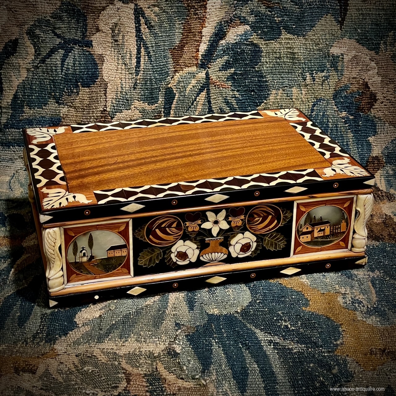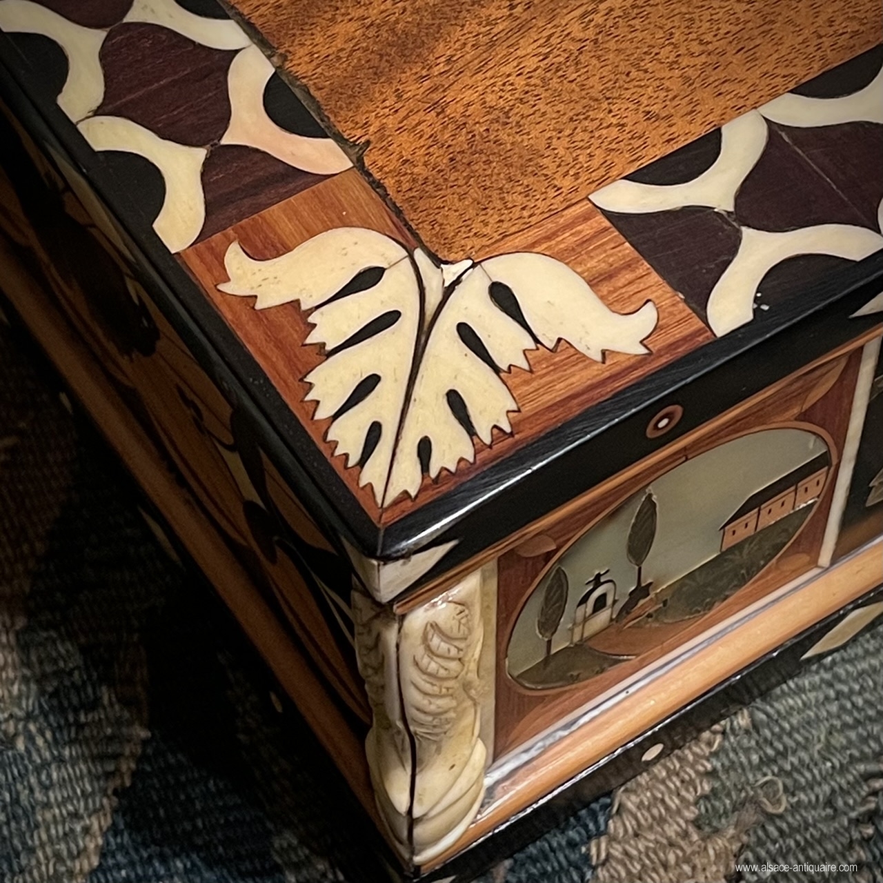 Décor très varié pour ce joli coffret marqueté d’ébène, d'os, de nacre, et de buis, de palissandre et de bois fruitiers. Toutes les faces présentent des motifs différends tantôt géométriques, tantôt naturalistes, ou architecturaux . Époque XIX ème siècle.