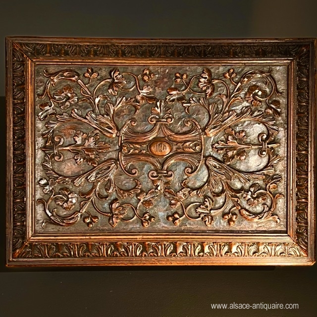 Rare coffret de courtoisie ou de mariage en noyer, Italie, XVII ème, qui utilise les éléments typiques des décors de la renaissance.
