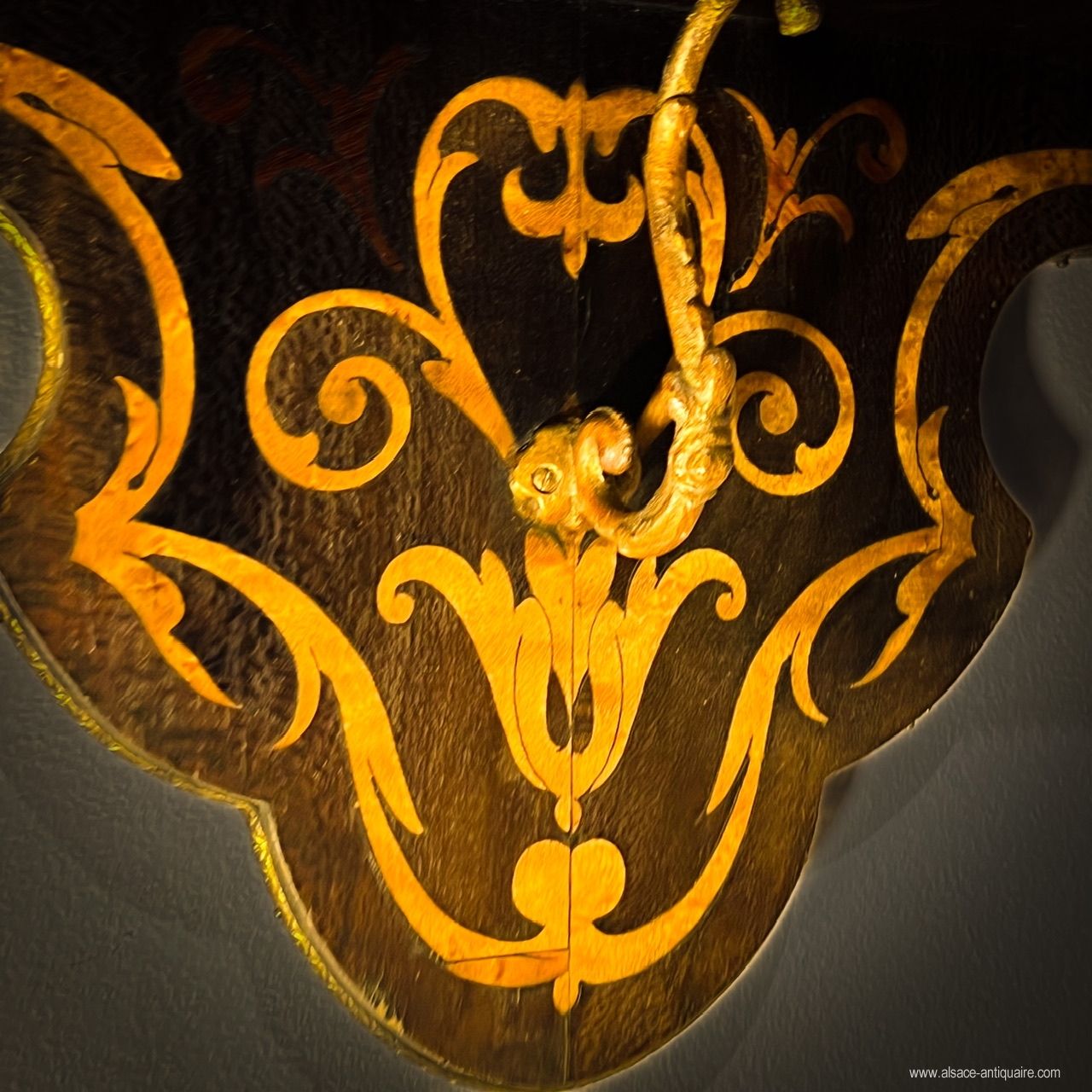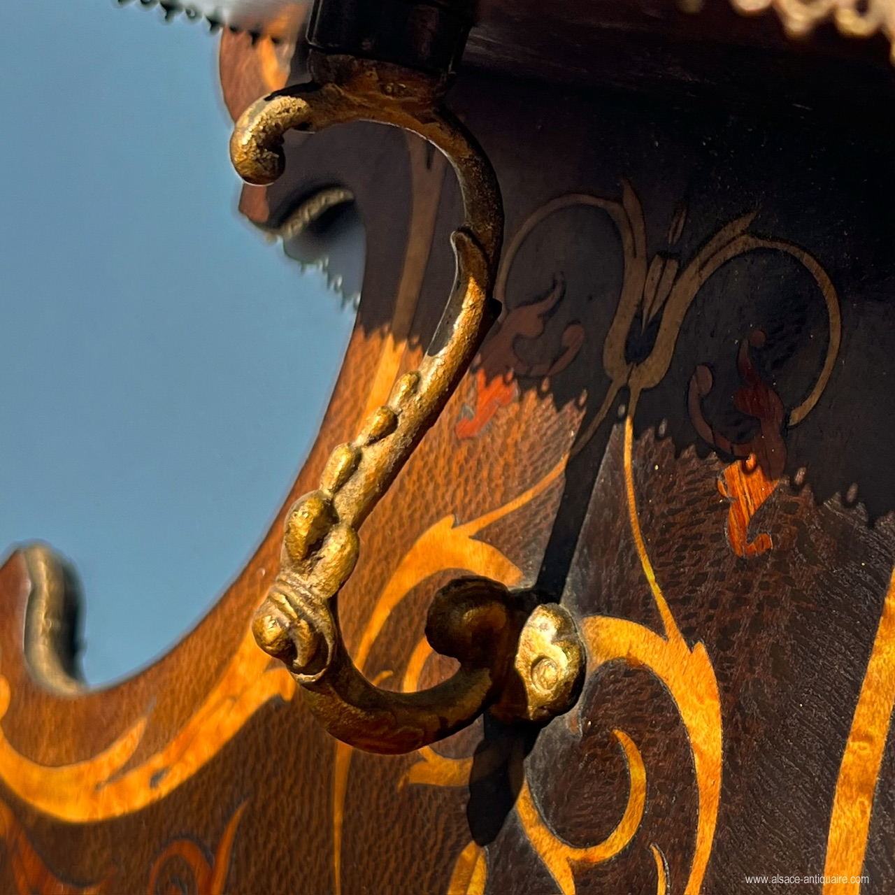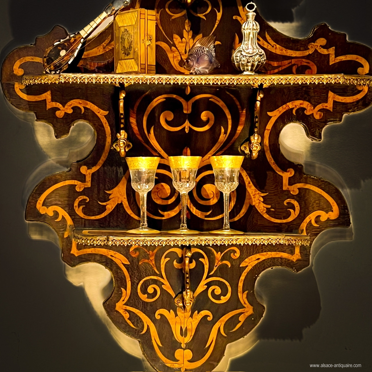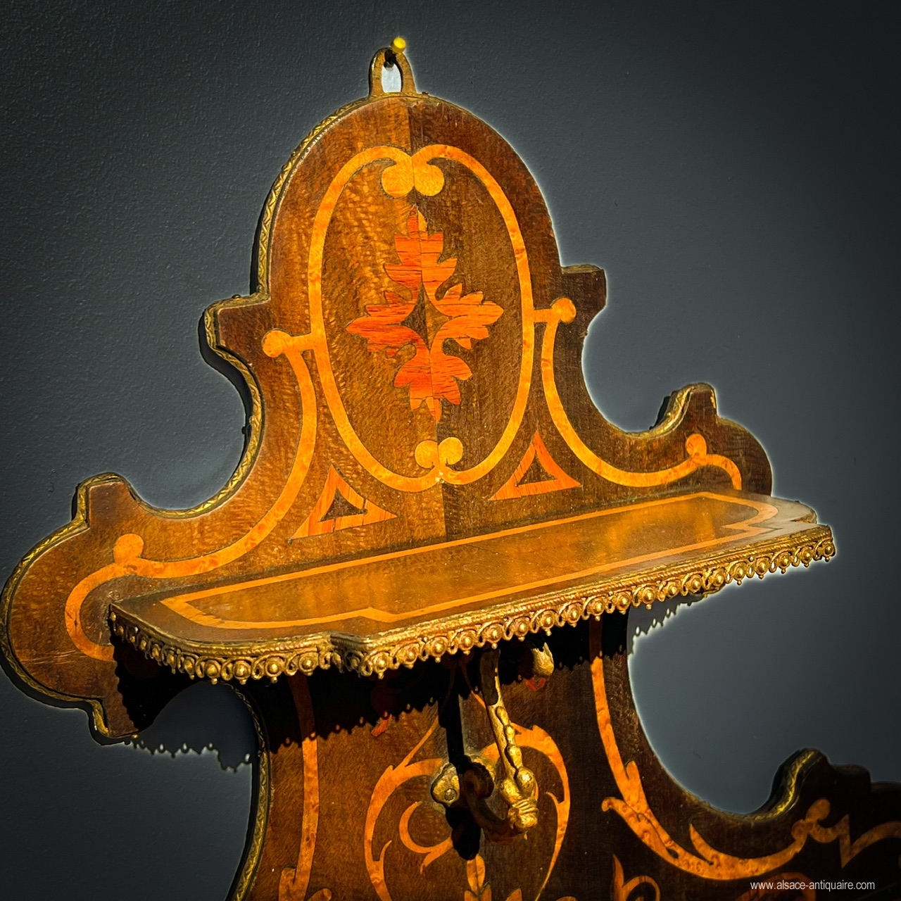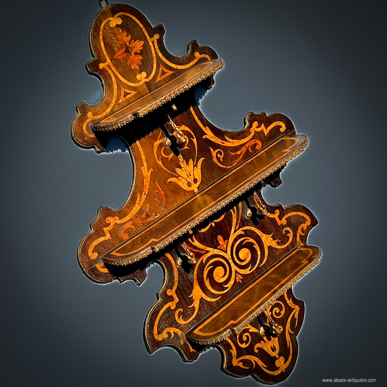 Étagère murale aux contours chantournés et plateaux habillés d'une galerie en bronze, décor marqueté de rinceaux et