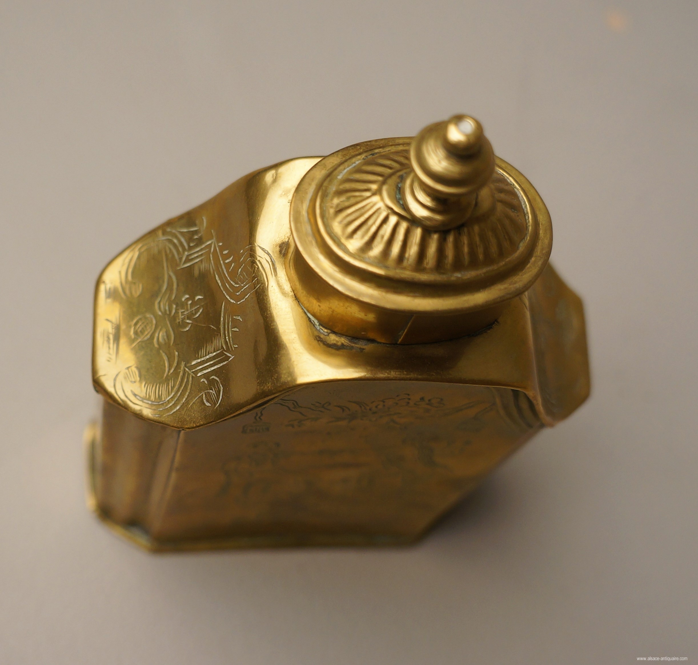Bouteille en laiton, avec sont couvercle au chapeau godronné, les montants sont chantournés, la partie supérieure du corps est façonnée en chapeau de gendarme,tous les flancs sont finement gravés et decorés de motifs floraux et scênes galantes sur le thême de la danse.Travail de la fin du XVIII ème siècle.