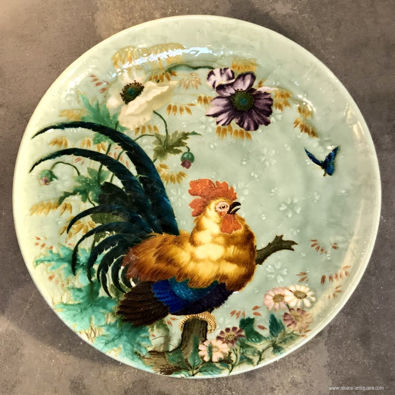 Couleurs aux reflets métalliques exceptionnelles pour ce grand plat au coq fond céladon clair. Signé au dos TH. DECK et du tampon à l’effigie ie de Théodore Deck ( Guebwiller 1823 - Paris 1891)