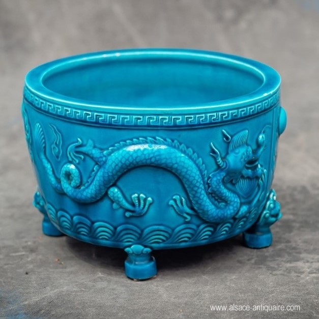 joli modèle de forme circulaire sur trois pieds, décor périphérique de dragons de style chinois, faïence avec couverte émaillée du fameux "bleu Deck" pièce signée TH. DECK du tampon en creux sous le dessous.