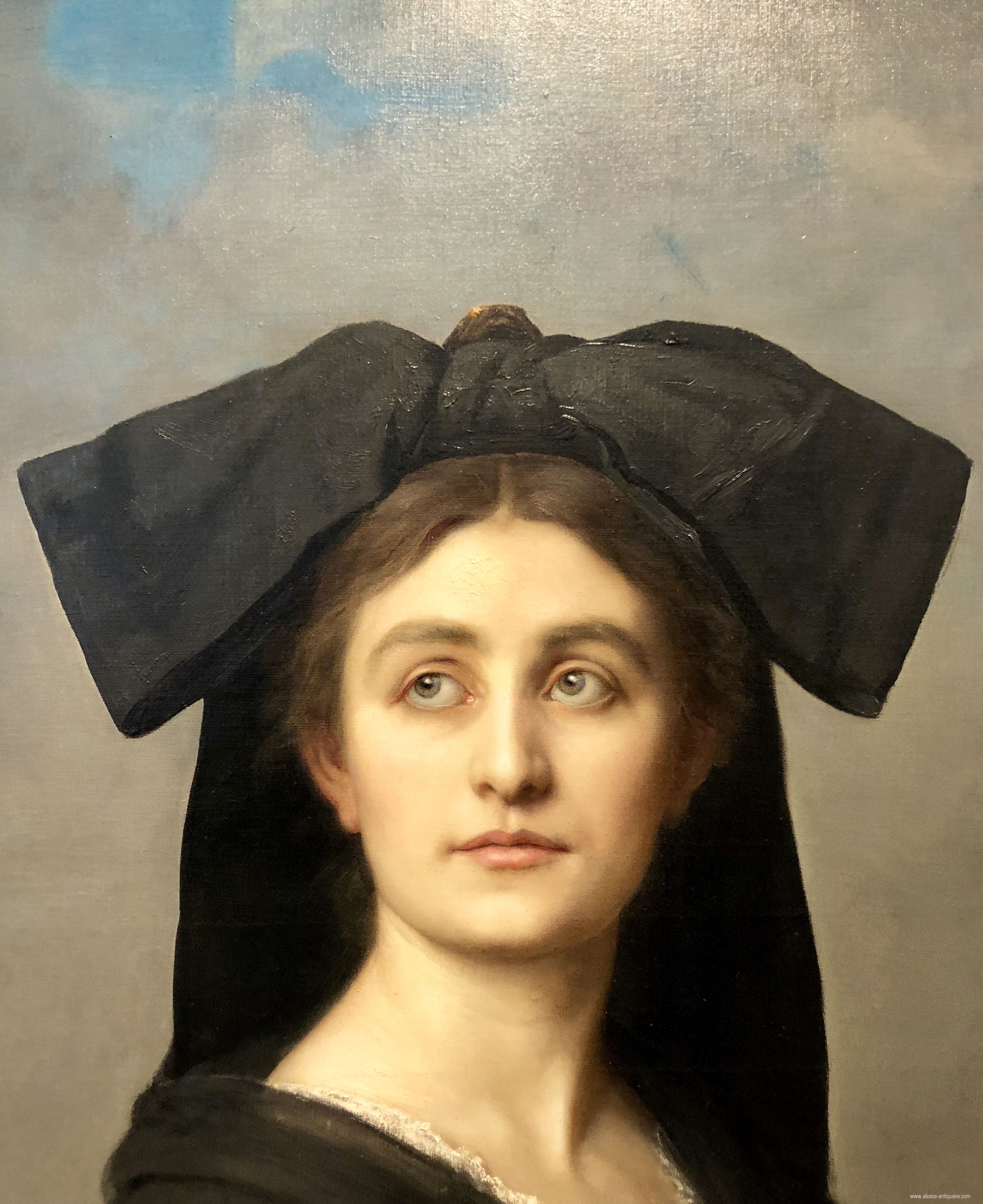 Une belle alsacienne, le regard clair portant au loin, un visage serein, le costume et la coiffe sombre, les discrètes fleurs rouges et bleues sur le fond blanc du corsage pour la présence patriotique, seule touche de couleur à parts les yeux, autant de symboles réunis dans une œuvre parfaite pour pour représenter cette Alsace perdue et abandonnée par la France. Cette toile exceptionnelle, signée Jean Benner, n’est pas sans rappeler le tableau de son grand ami Jean Jacques Henner, « l’Alsace : elle attends » , œuvre commandée par Mme Kestner de Thann et qui fut offerte à Garibaldi, pour le remercier de son dévouement à combattre l’abandon de l’Alsace à l’Empire allemand , matérialisé lors de la signature du traité de Francfort le 10 mai 1871. Cette œuvre fut un symbole et sera publiée dans tous les livres scolaires d’histoire édités en France de la fin du XIX ème au début du XX ème . Jean Benner, très attaché, comme Henner, à sa terre natale à probablement voulu appuyer cette démarche en réalisant avec son style une œuvre majeure dégageant une grande force symboliste. Très beau cadre de l’atelier Knoll de Bâle. Huile sur toile. Signée bas droit « Jean Benner ».