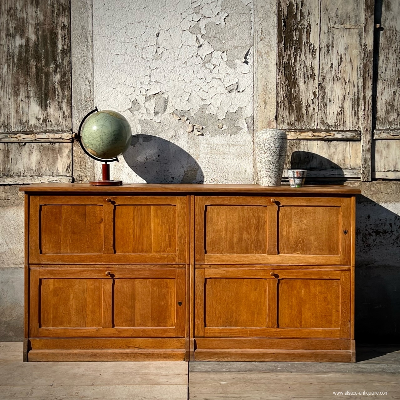 Très fonctionnel, et original par sa conception avec ses 4 portes abattantes, ce meuble à hauteur d'appui a été réalisé au début du XX ème siecle pour compléter le bureau du directeur d'une importante entreprise dans les domaines du paysage et de l'horticulture de notre région. Réalisé en chêne blond , il bénéficie d'une belle patine ancienne, les abattants découvrent des rangements dans les quels on pourra positionner des livres, classeurs, ou de la vaisselle, car ce meuble pourra être détourné de sa fonction initiale pour aménager un coin repas ou un séjour, il pourra également aisément compléter une déco d'esprit industriel. Le meuble est démontable. Bon état avec quelques traces d'usages . Dimensions longueur 216 cm x112 cm x profondeur 41 cm. Les objets de décoration, mappemonde et vases, ne sont pas inclus dans le prix et peuvent faire l'objet d'une offre spécifique.