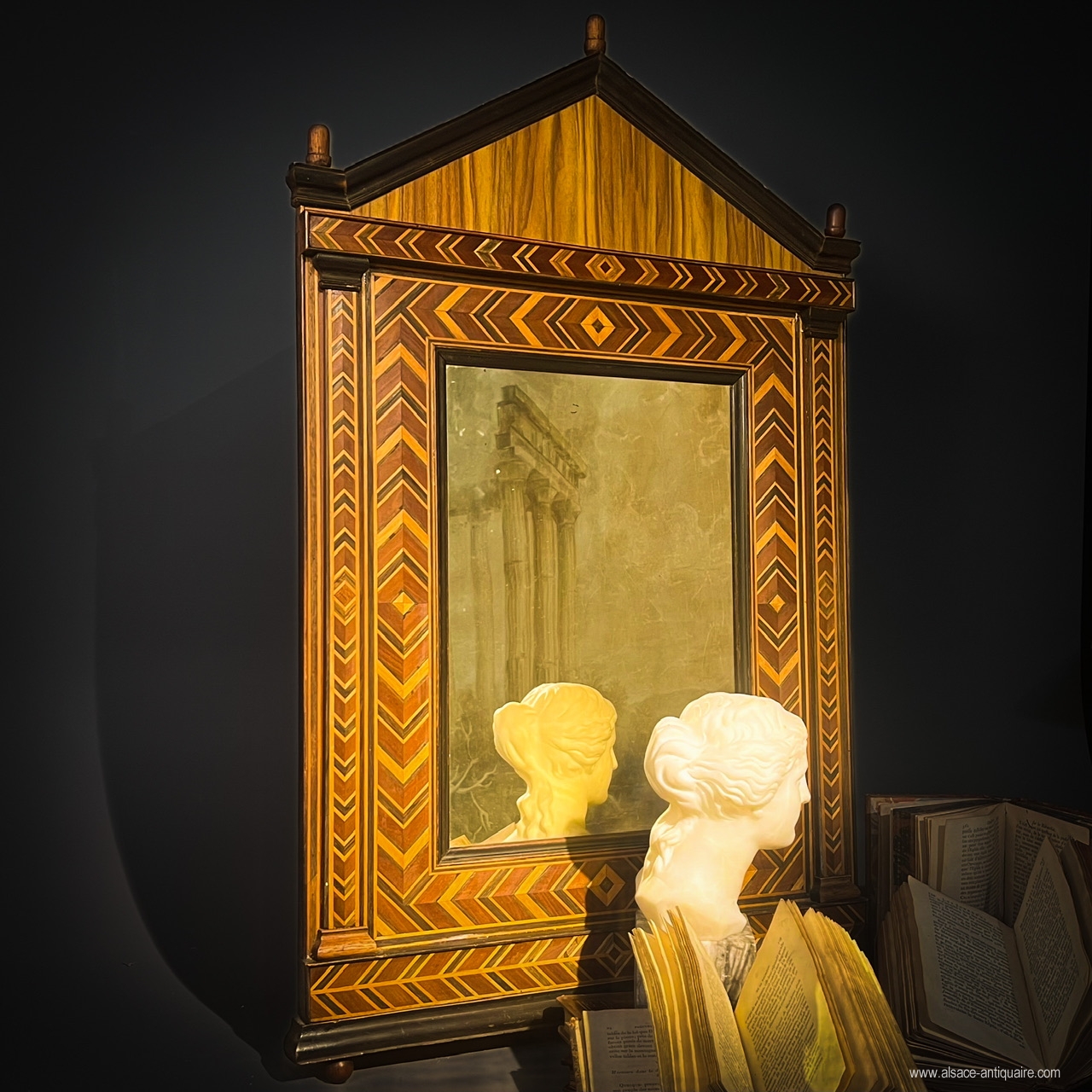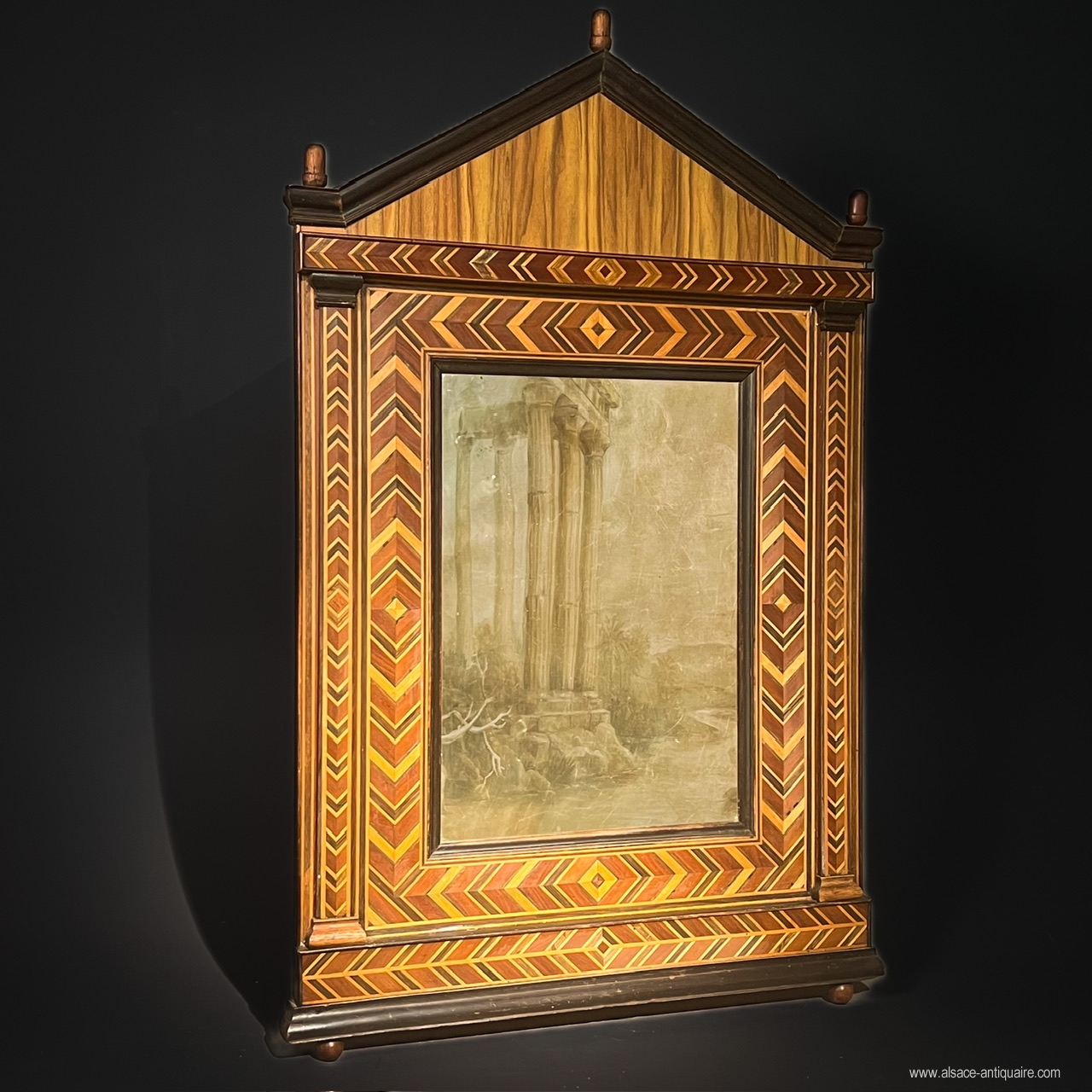 Beau décor de chevrons et de pilastres pour ce cadre de miroir au fronton triangulaire coiffé de 3 clochetons en bois tourné. Les motifs sont réalisés en bois de pays, noyer, érable et fruitiers alternant les essences claires et foncées , socle et fronton sont soulignés par des moulures de bois noirci, les montants latéraux sont doublés de pilastres plats . Beau travail d’époque XIX ème . 82 x 51 cm .