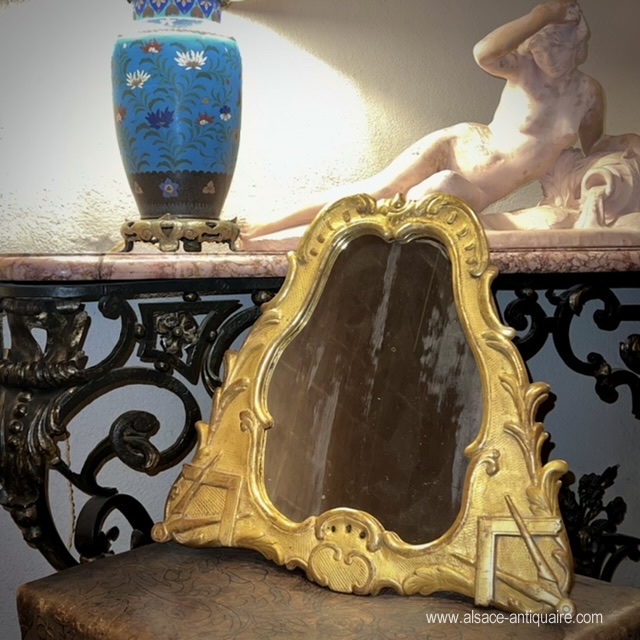 Miroir de forme triangulaire, bois doré sculpté, rinceaux et coquilles, attributs maçonniques, équerre et compas, dans les angles inférieurs. Miroir ancien avec traces légères d'oxydation Époque 18 ème siècle.