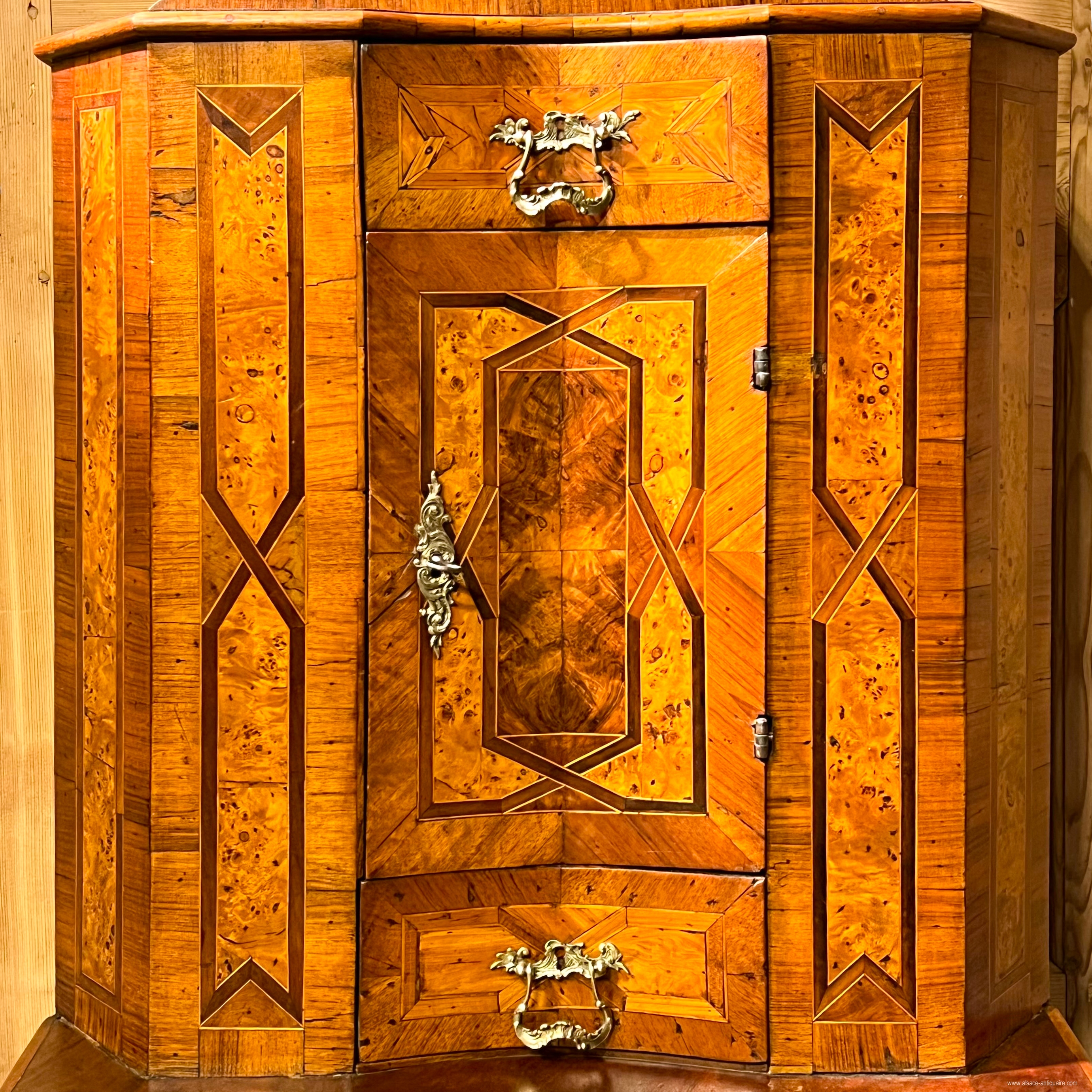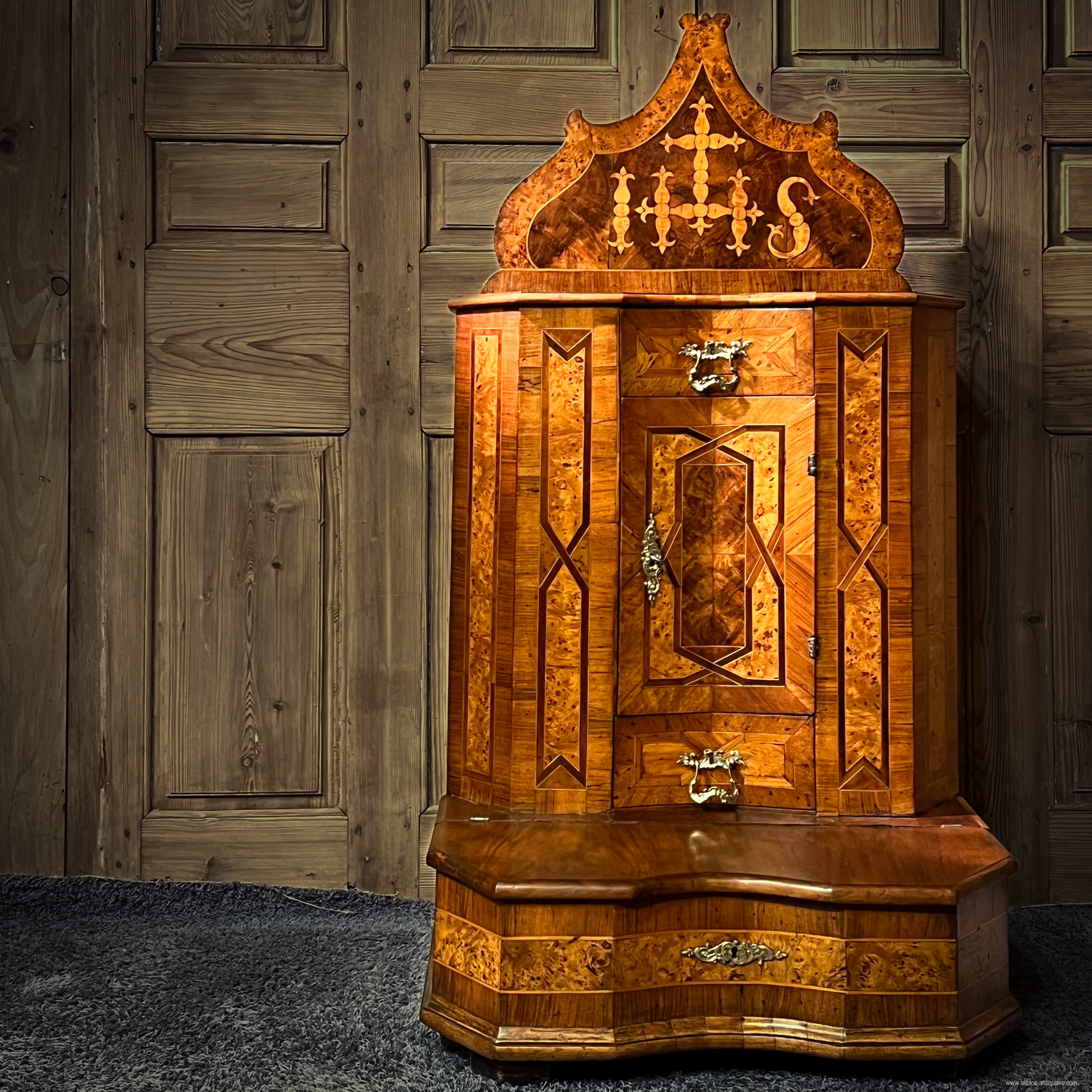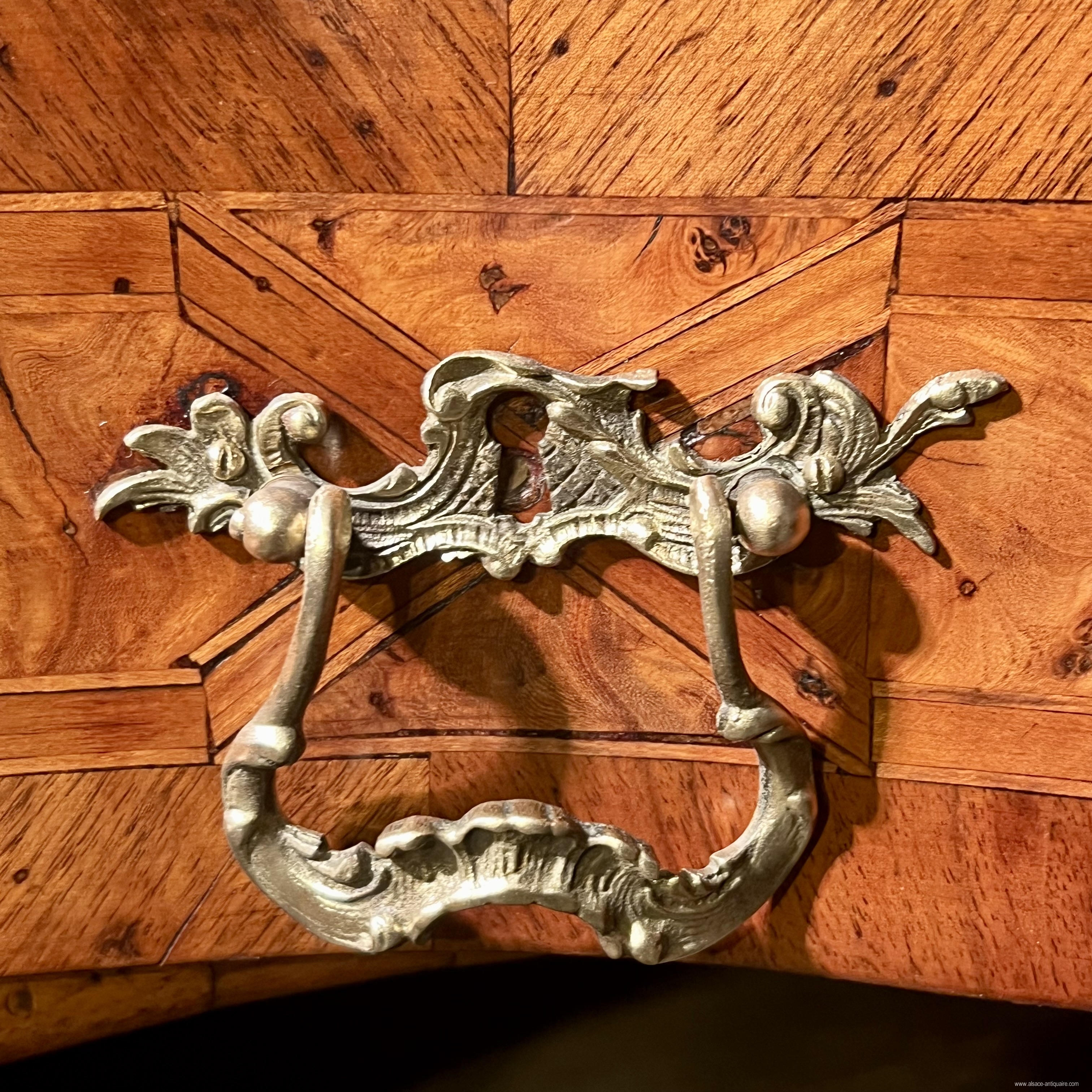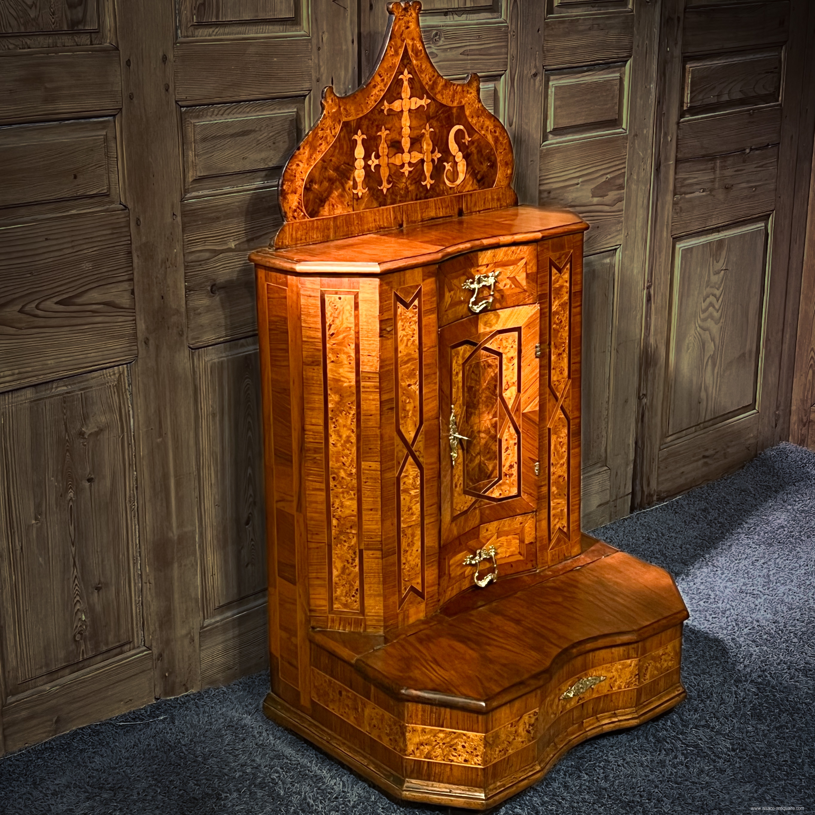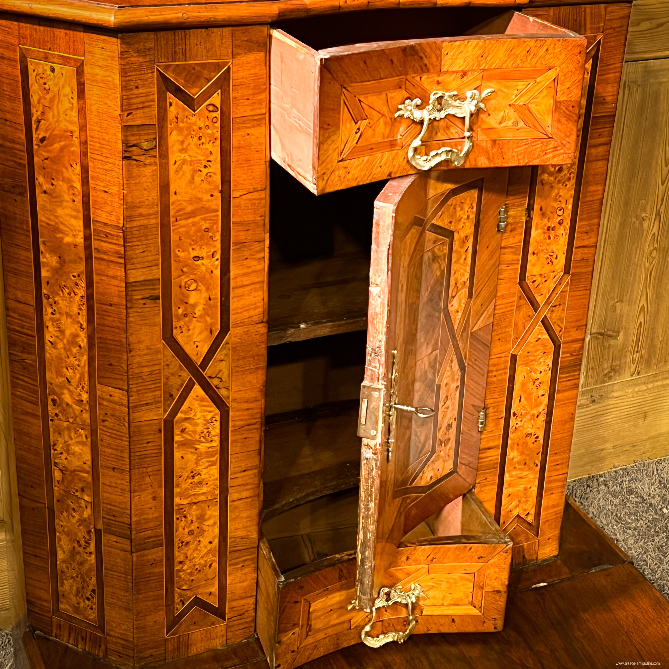Beau décor de filets de marqueterie en entrelacs pour ce meuble 18 ème, le corps central présente un galbe concave enserré entre deux pilastres à pans coupé , aménagé avec deux tiroirs et une porte, la base est composée d'un socle épais dont le couvercle amovible, tel un coffre, découvre un volume de rangement. La partie supérieure est coiffée d'un fronton aux contours chantournés marquetée des chiffres religieux IHS .