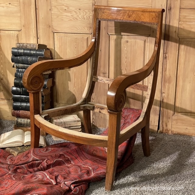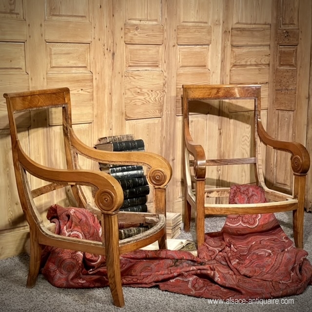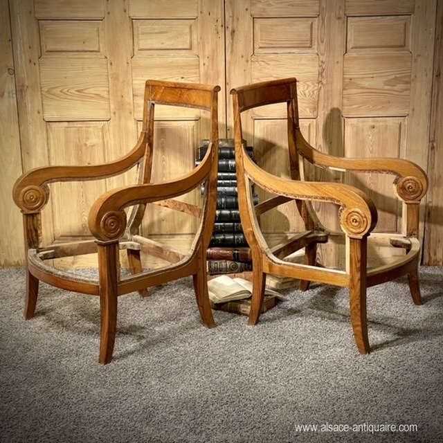 Belle paire de bergères Empire, fauteuils à pieds sabre, accoudoirs à crosse, les sièges ont été entièrement démontés et les assemblages consolidés et recollés, taquets pour tapisserie mis en place , beau veinage de bois et belle patine . Epoque 1 er tiers du XIX ème . Parfait état.