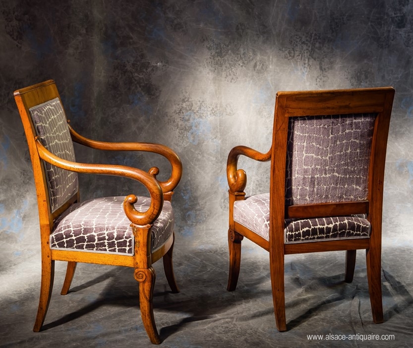 Paire de petits fauteuils à crosse, regarni avec tissus contemporain finition double passe-poil. Epoque XIX ème siècle.