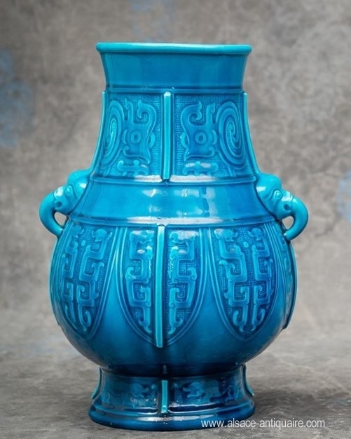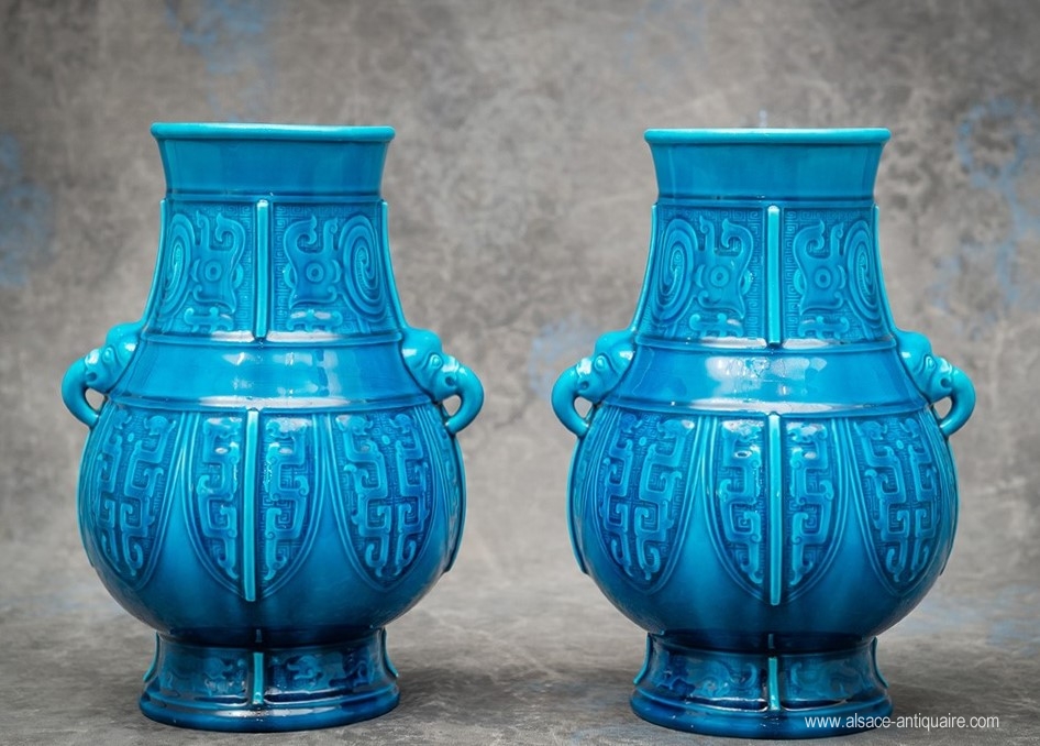 Pour cette belle paire de vases, Théodore Deck s'est inspiré des bronzes de la Chine ancienne pour créer ce décor, tout en finesse, dans ces fameuses tonalités de bleu qui firent sa réputation, anses en tête d'éléphant. Epoque XIX ème siècle - Signés du tampon en creux sous la base TH DECK.