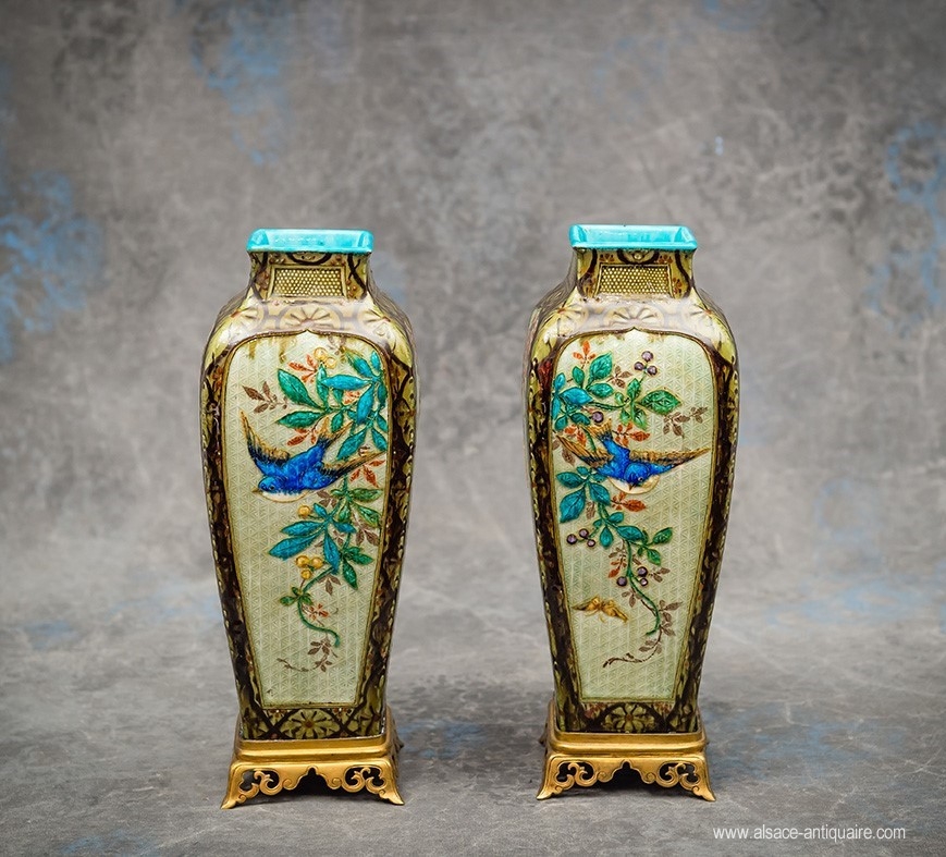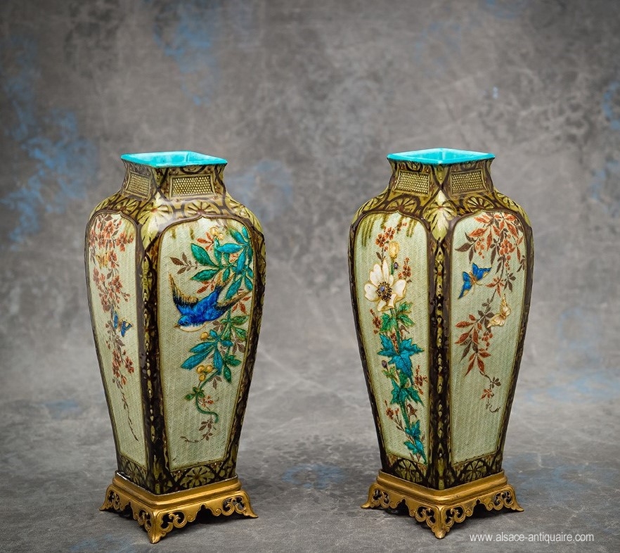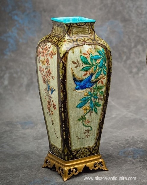 Belle paire de vases de section carrée, montés sur socle bronze ajouré, décor japonisant de fleurs et oiseaux sur fond céladon cernés d'une bordure en nid d'abeille. Signés du tampon en creux TH DECK sous la base. Epoque XIX ème siècle.