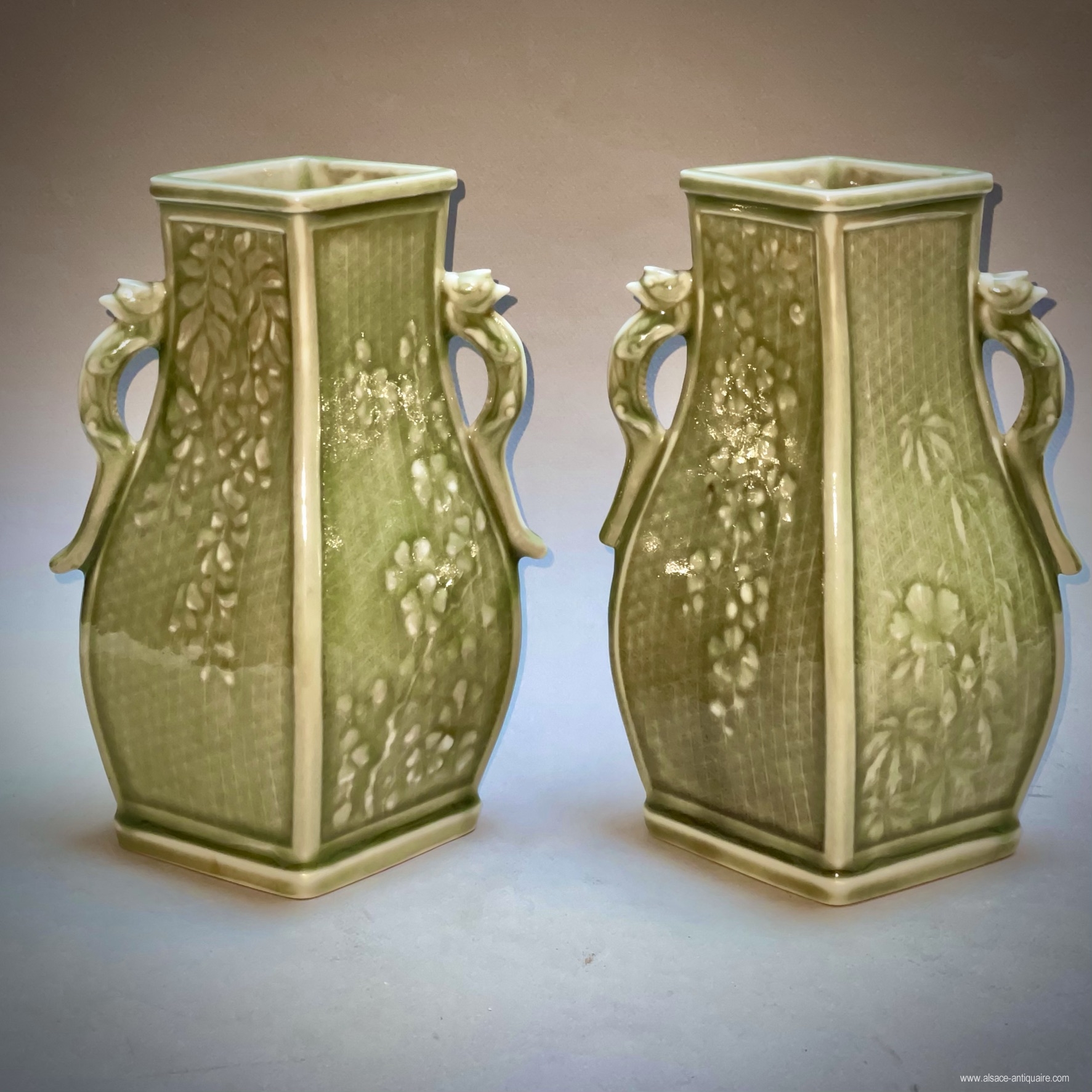 Forme rare, ces deux vases présentent une section en losange, les anses simulent des lézards qui grimpent le long d’un mur. Le fond du vase est parsemé d’un semi géométrique de fleurs stylisées servant de support à un jeu de branchages fleuris . Belle couleur céladon. Signés sous la base Th.Deck