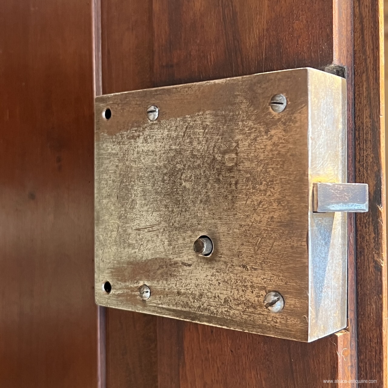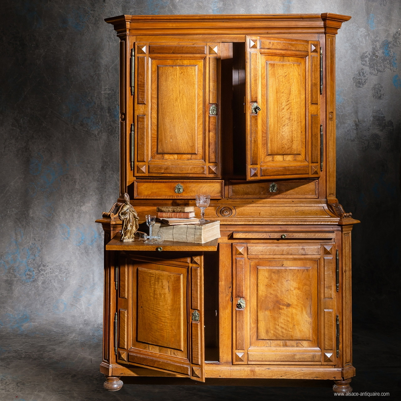 Meuble très architecturé et de conception originale. Ce buffet à deux corps comporte quatre portes, deux tiroirs et deux tirettes. Le bâti est conçu avec des angles à pans coupés habillés de pilastres moulurés et soulignés par un décrochement en saillie de la corniche et du socle, la liaison entre le corps du haut et le corps inférieur se fait par un large socle mouluré, galbé et concave, dont les angles sont sculptés d’une console à volute . Les tiroirs sont intégrés dans le corps supérieur et les tirettes dans le corps inférieur. Les cadres de portes sont habillés en applique de petits coussins rectangulaires au contour mouluré, dont la liaison aux angles se fait par un bossage en pointe de diamant . Belles entrées de serrure en bronze. Une exceptionnelle qualité de noyer à été sélectionnée pour l'exécution de ce très beau meuble 18 ème, dont le dessin à su concilier puissance, élégance et sobriété .