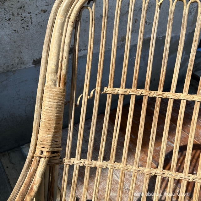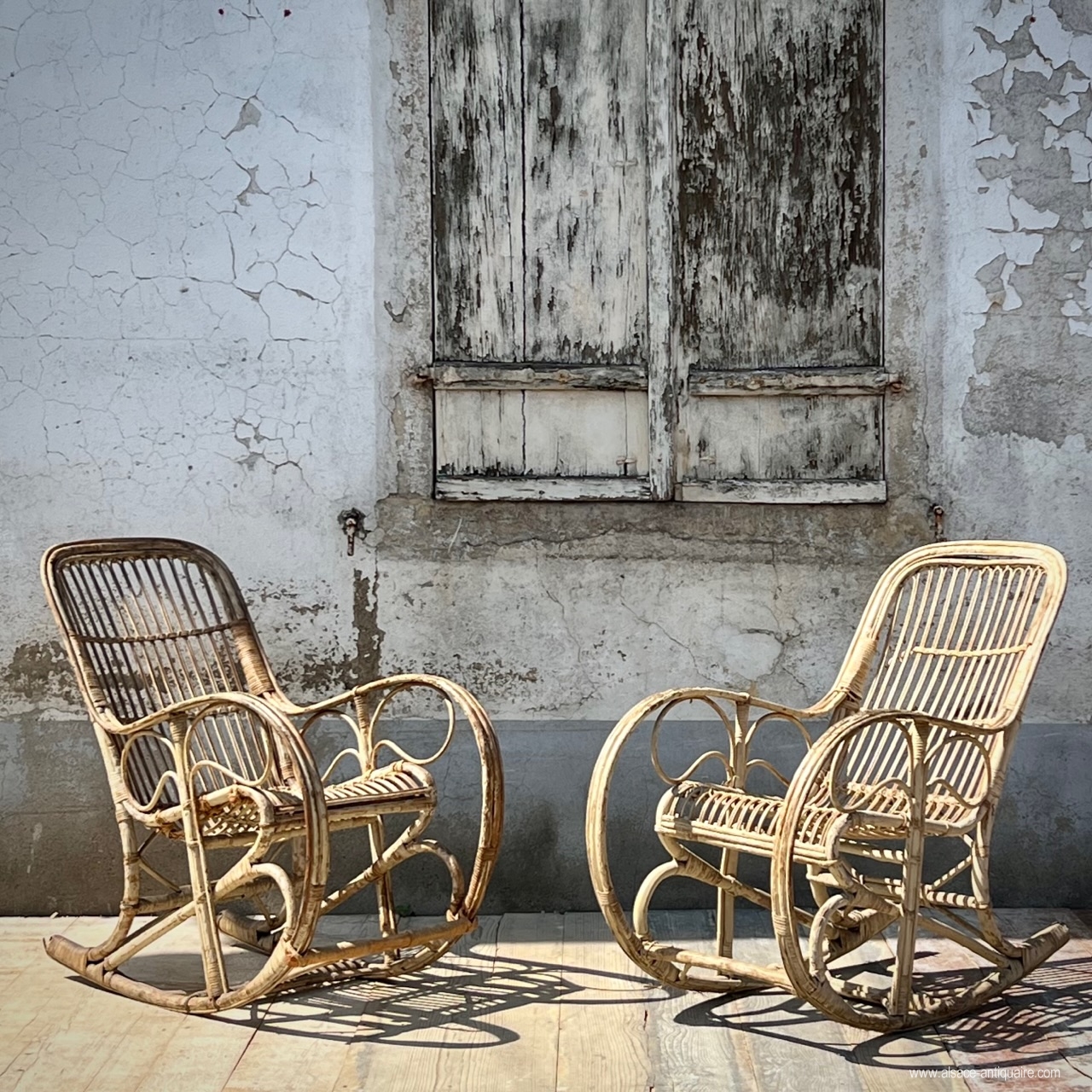 Beau dessin pour cette paire de rocking chairs en rotin , idéale pour compléter une décoration bucolique dans une véranda, un séjour ou un hall. Les fauteuils à bascule sont Napoleon III et d’époque XIX eme siècle, ils se mélangeront également avec brio dans un intérieur vintage. Sièges dans leur jus d’époque, quelques brins de rotin accidentés .