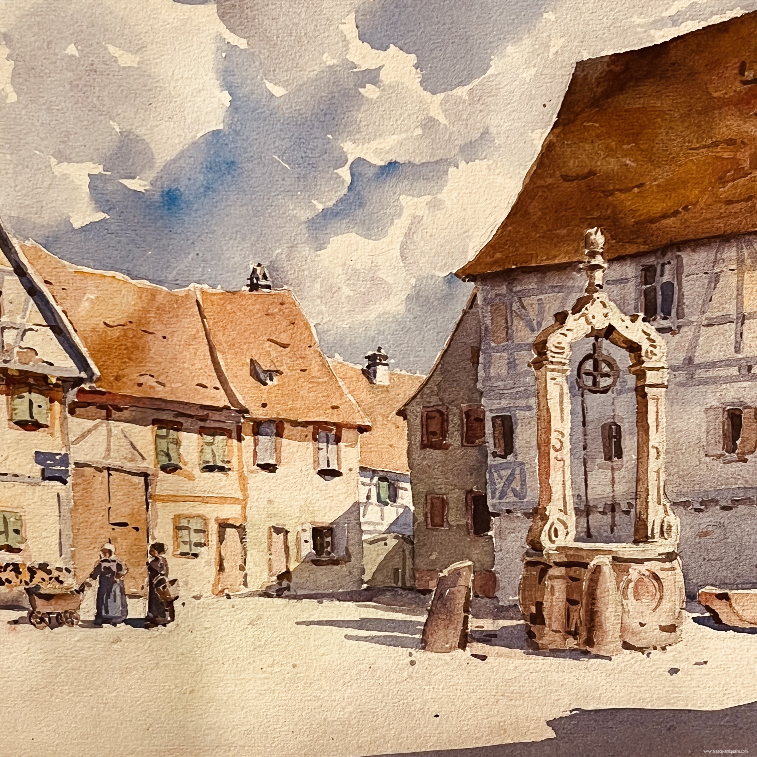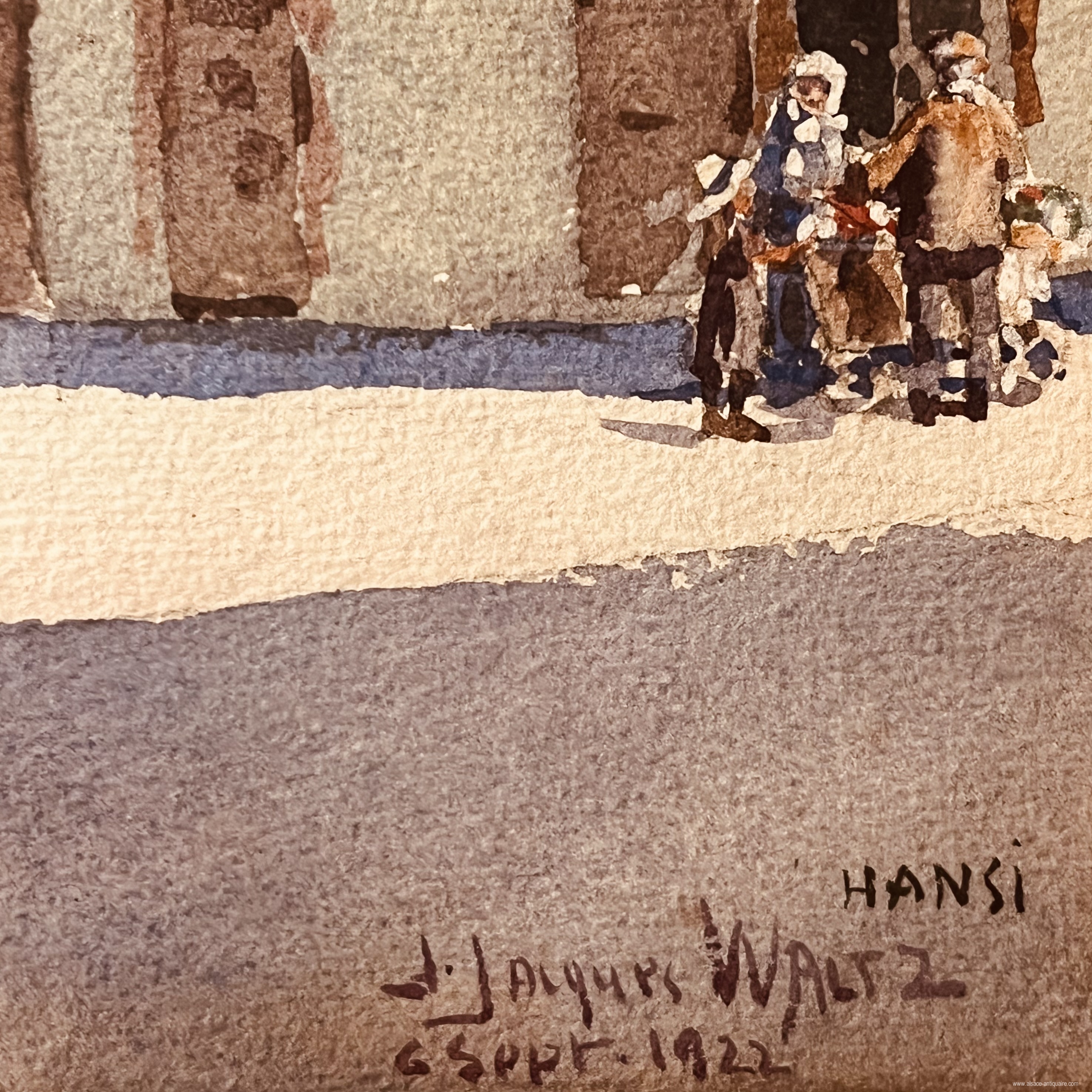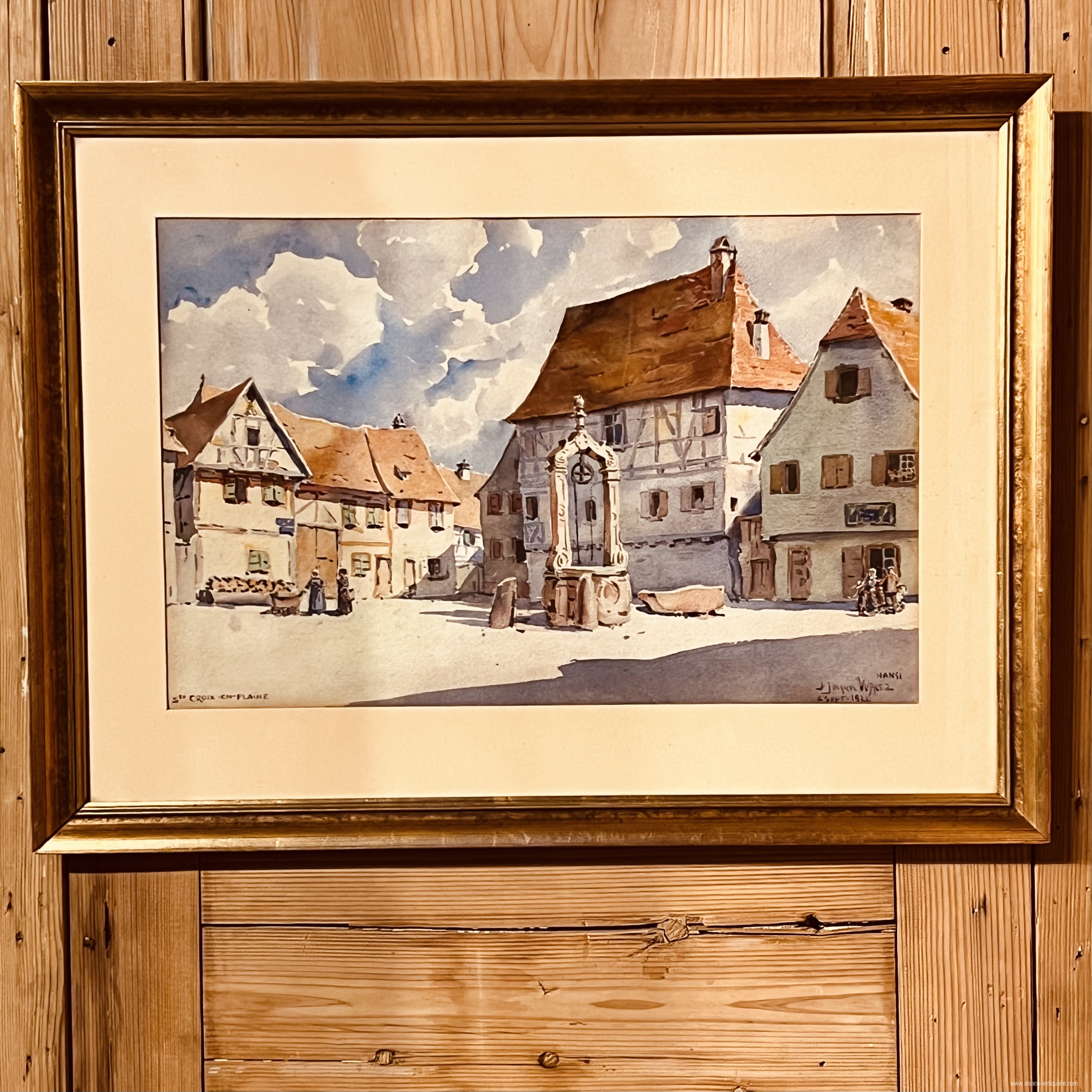 Belle fraicheur de couleurs pour cette grande aquarelle signée Hansi contre-signée J. Jacques Waltz et datée 6 septembre 1922 sur le bas droit . Est représenté ici la place principale du village alsacien de Sainte Croix en Plaine.