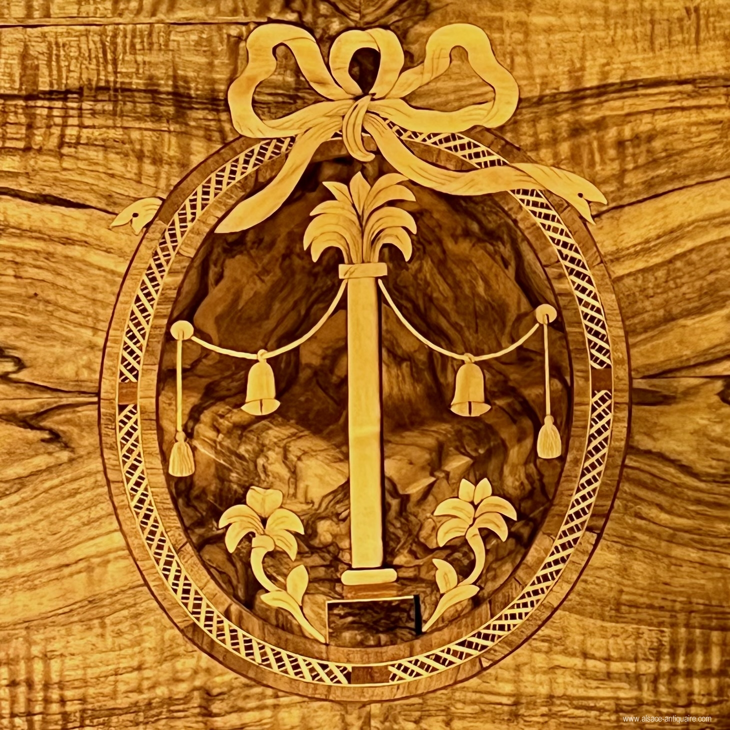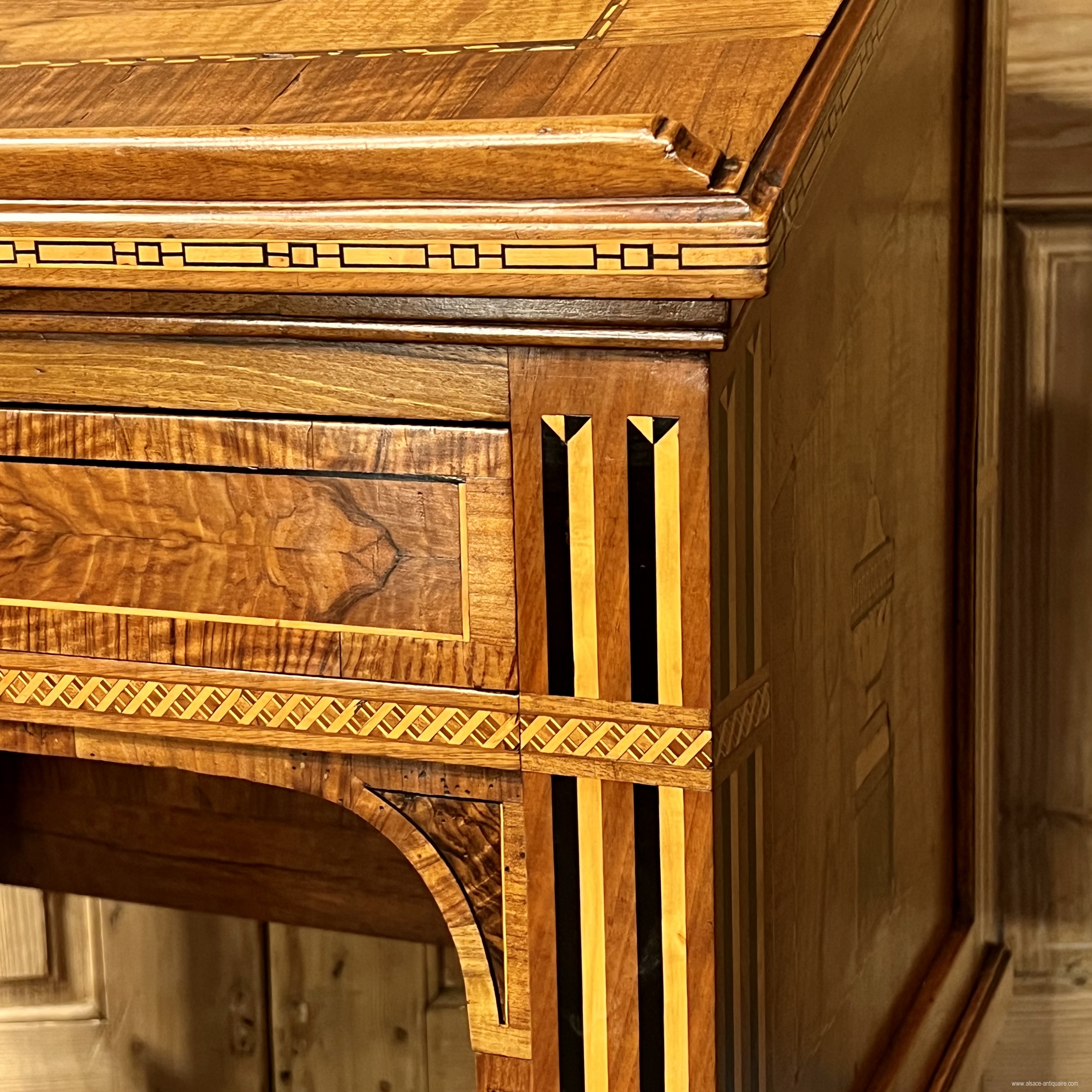 Meuble rare , ce secrétaire est marqueté de noyer et d’un décor Louis XVI original d’inspiration néoclassique . L’abattant présente en son centre un médaillon ovale dont les contours simulent une tresse feuillagée, au centre une colonne coiffée d’un chapiteau dorique est surmontée d’un boisseau de feuilles de palmier. Les cotés sont habillés d’un vase couvert posé sur un entablement et dont la panse est ceinturée de motifs à la grecque. Le dos du meuble est également parfaitement fini avec un frisage de noyer bordé d’un filet alternant bois clair et foncé, enserrant une guirlande de laurier soutenue par trois passants . Des cannelures simulées, alternant bois clair et foncé, habillent les montants, ces derniers s’appuient sur des pieds gainés de section carrée, dont le dé est décoré d’un motif architectural à 3 colonnes et souligné par un lambrequin en bois contrasté.