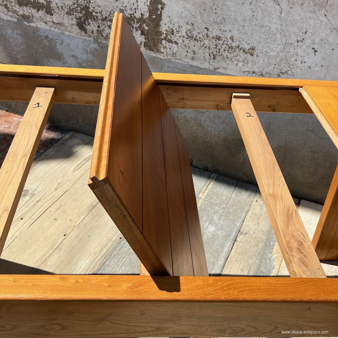 Beau design pour cette table rectangulaire et extensible, avec ce raccord circulaire du pied sur la ceinture et ce plateau à lames larges, le bois utilisé est l’orme.Elle est issue de l’atelier alsacien Regain Reinhard aujourd’hui disparu, qui fut longtemps spécialisé dans la conception et fabrication de meubles contemporains en orme. Très fonctionnelle, les deux moitiés du plateau , doublés d’orme, coulissent à l’intérieur de la ceinture et découvrent une allonge dans la même esthétique que le plateau principal et qui pivote sur un axe pour se positionner entre les deux autres parties . Deux petites allonges de service permettent d’augmenter la dimension pour arriver à 2,57 m d’ouverture totale.