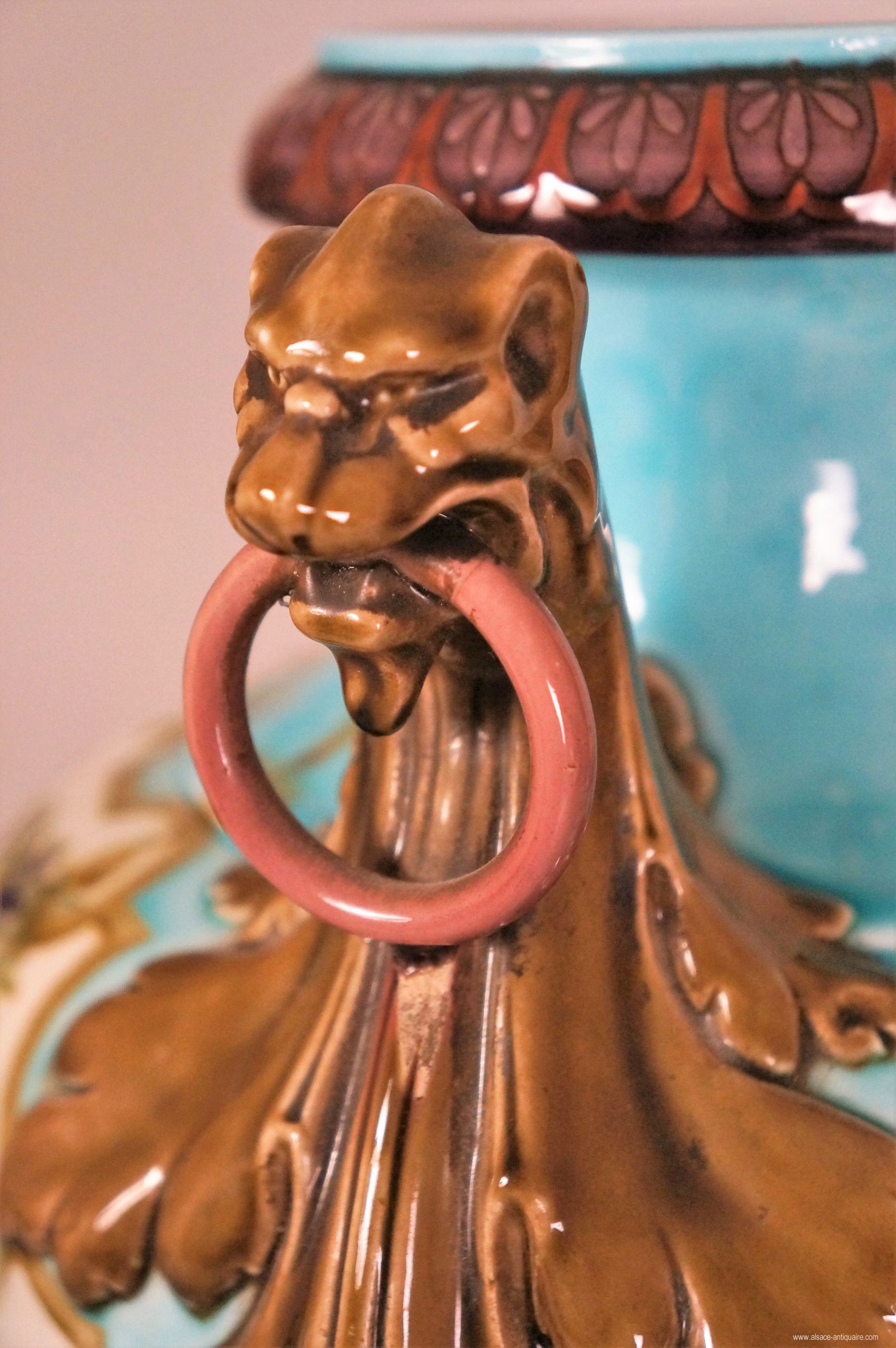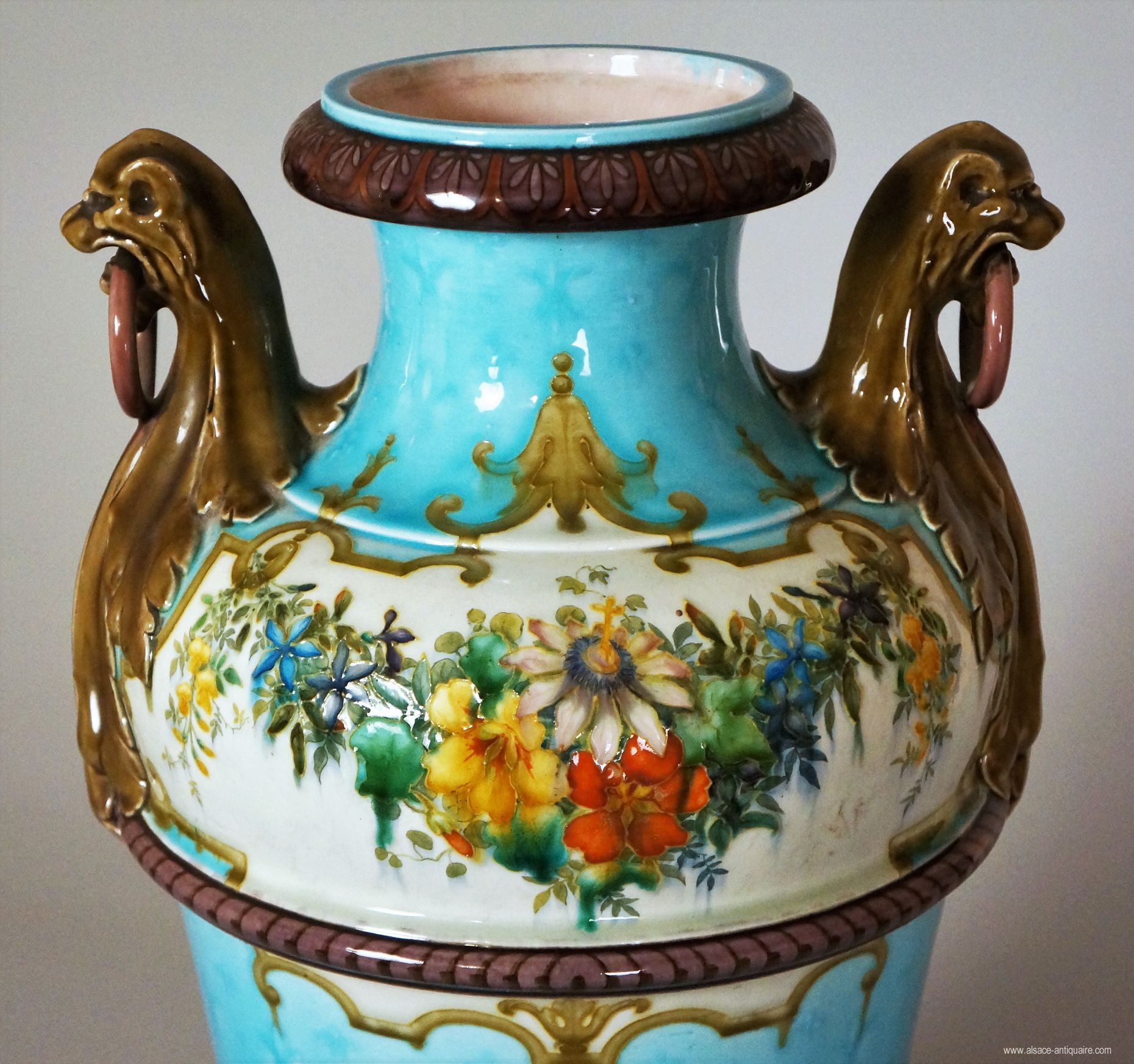 Rare et grand vase de forme circulaire réalisé dans le gout de la renaissance très en vogue au cours du dernier quart du XIX ème siècle. Cette pièce est signée Théodore Deck, le décor est aussi rare que la forme de ce modèle , le fond bleu ciel cerné de tores aux couleurs bronze et d'anses en têtes de griffons tenant dans leur gueules un anneau, le col du vase s'appuie sur une frise polychrome au cœur de la quelle court une guirlande fleurie. Théodore Deck Epoque XIX ème siècle.