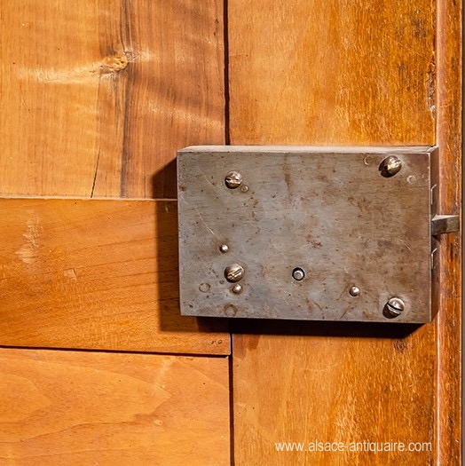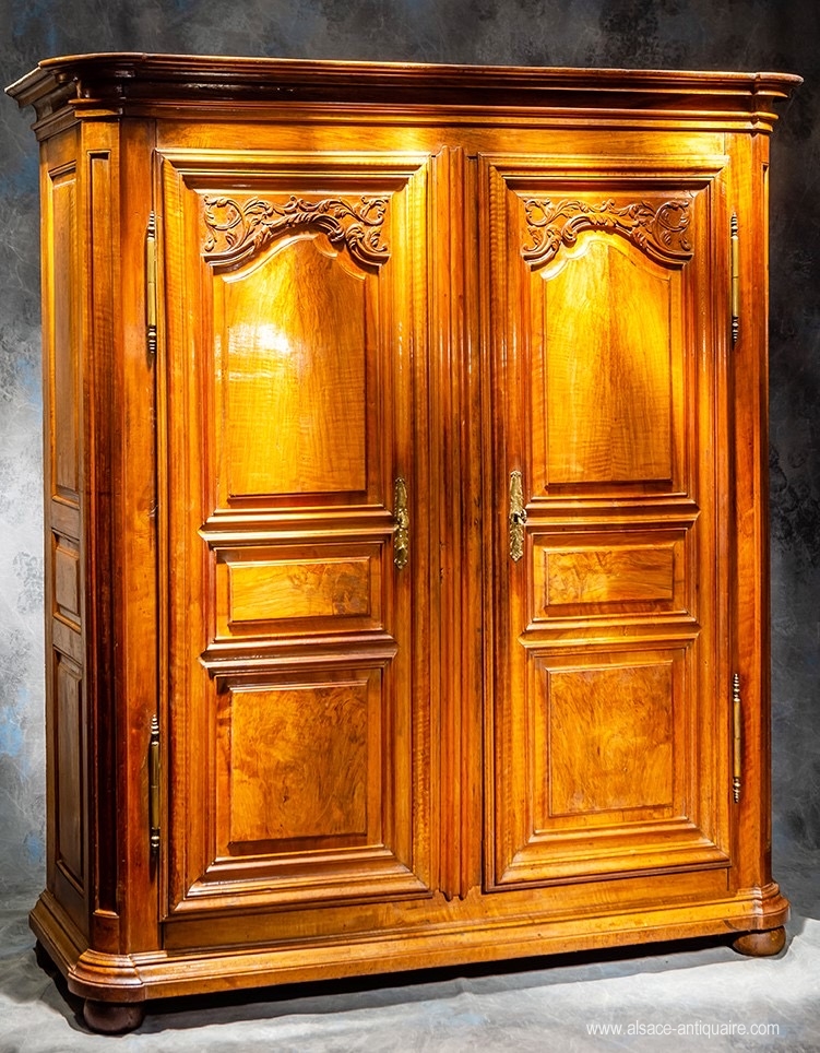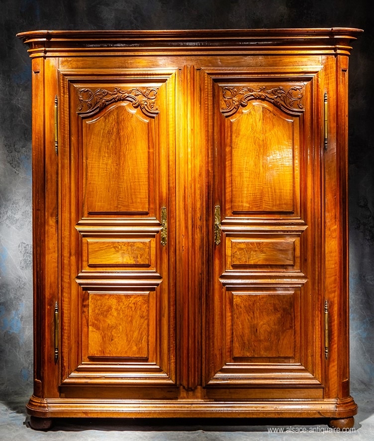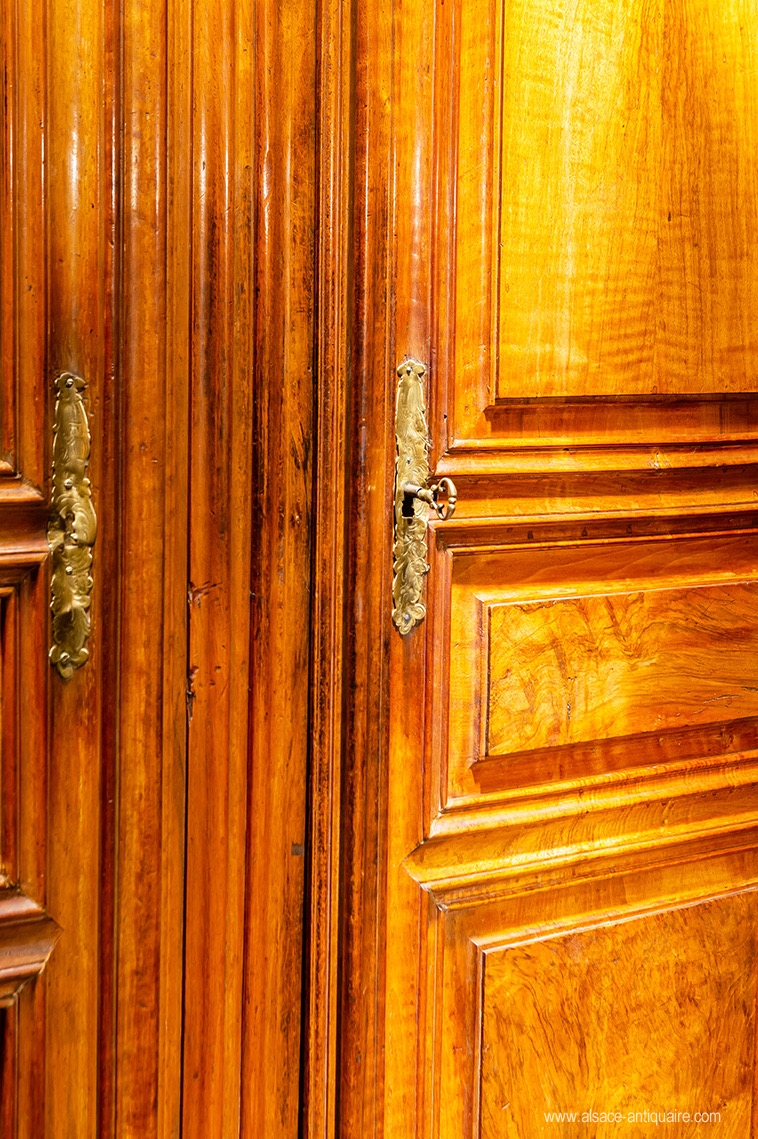 Wardrobe whose design is inspired by the models of the French corporation of cabinetmakers from Strasbourg, the upper crosspieces of the doors are fretted and carved with scrolls and scrolls, harmony and beautiful proportions characterize this beautiful Alsatian furniture of the eighteenth century, made of walnut. Beautiful original lock. Alsace - Strasbourg - Period 18th century.