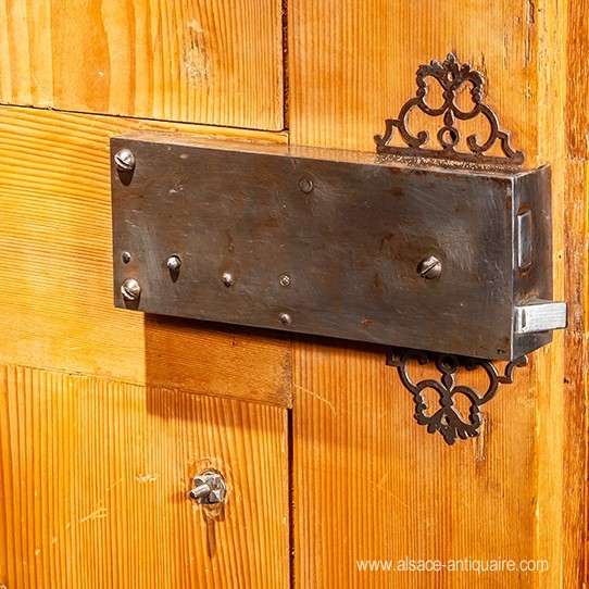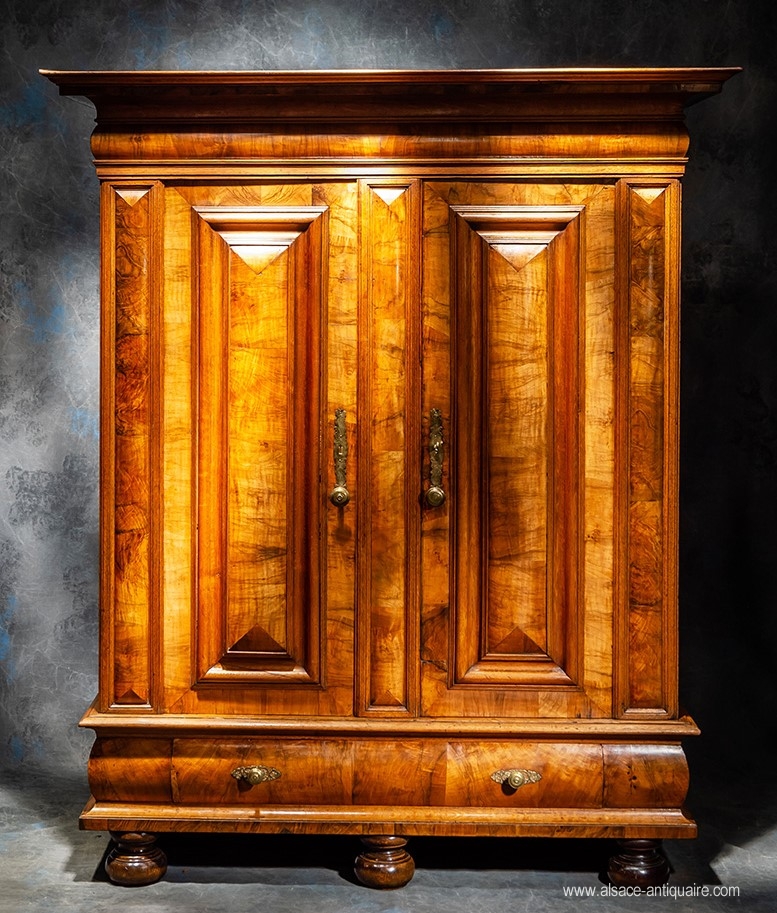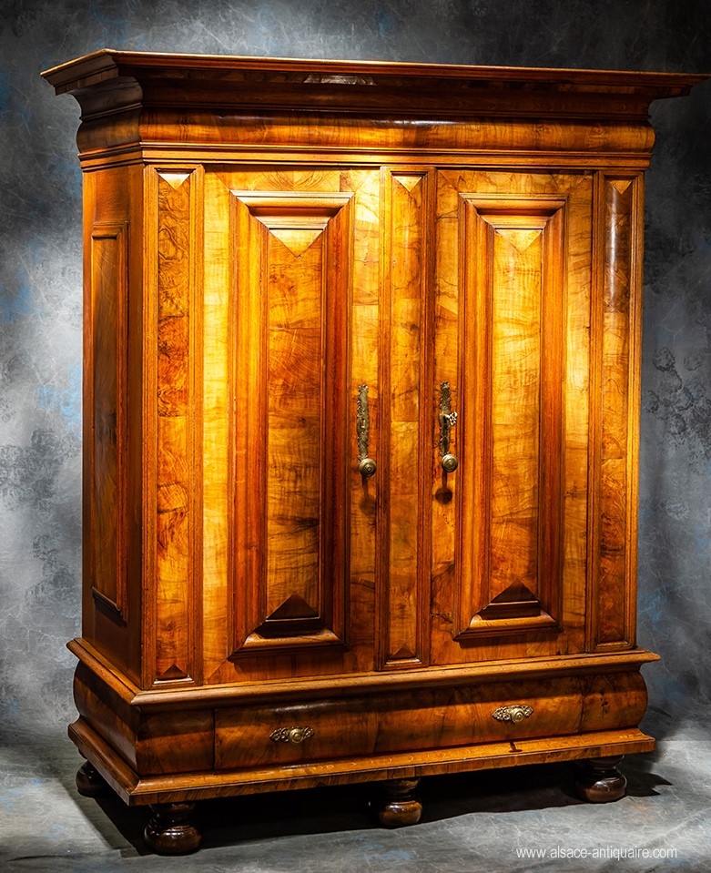Sober and restful design for this piece of furniture which characterizes the cupboards known as "with cushions", present for the panel of the doors a central motif of elongated shape in the form of a bastioned kiosk with soft and undulating moldings. The base, provided with a large drawer, and the cornice use the same type of arrangement with a large curved band inlaid with walnut. The rhythm is given by this alternation of large beaches inlaid with walnut and blond oak used for framing and protruding moldings. Very rare in its proportions and small dimensions giving it an unequaled charm, this Alsatian wardrobe is from the 18th century. Very beautiful engravings in engraved and chiseled brass and lock with openwork plates. Alsace. 18th century period