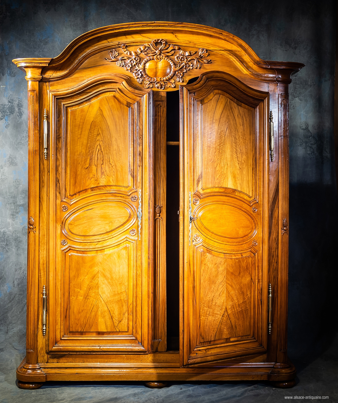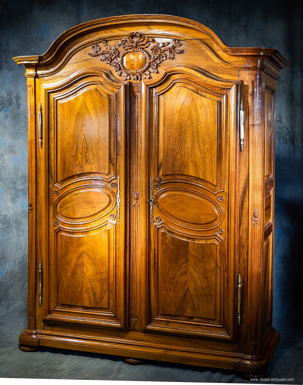 Wardrobe with pediment in gendarme's hat, doors with oval medallion. The design of this beautiful piece of furniture is, with this recess in the center of the top of the doors, characteristic of the Colmar workshops of the 18th century. Walnut .