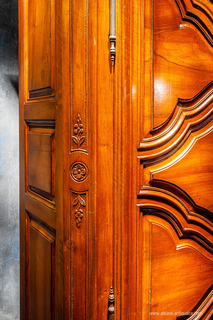 Exceptional walnut wardrobe with curved cornice in gendarme hat, doors with radiant molding simulating the rays of the sun, pillars with sculpted reserves. vineyard region, central Alsace, near Niedermorschwihr or Kaysersberg or Ribeauvillé. Nice lock. XVIII century.
