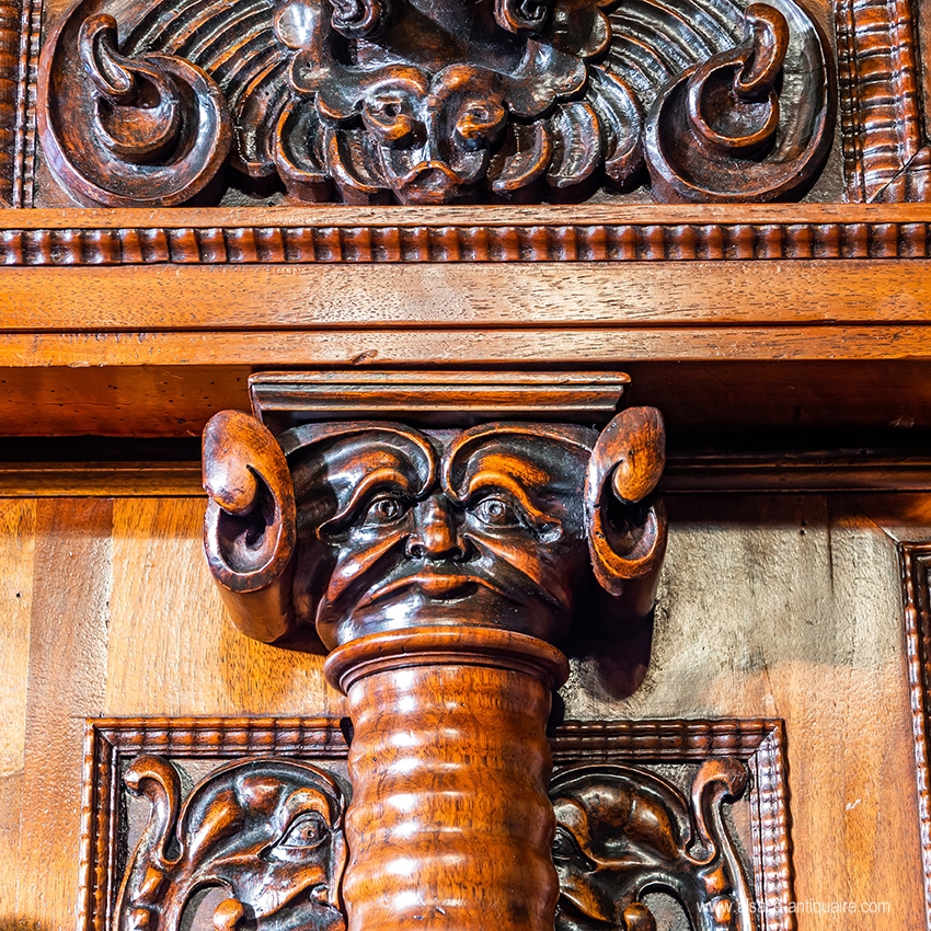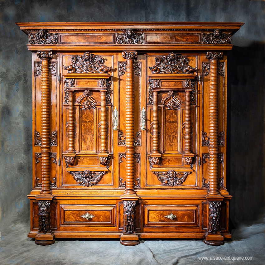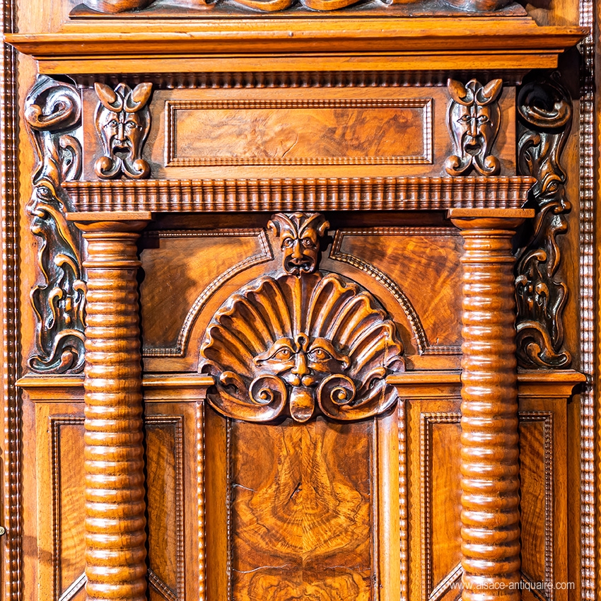 Rare cabinet from the Alsatian Renaissance, facade with 7 ringed columns, in walnut, fir tree frame, auricular-type sculptures, locks and hinges in engraved iron. 17th century period