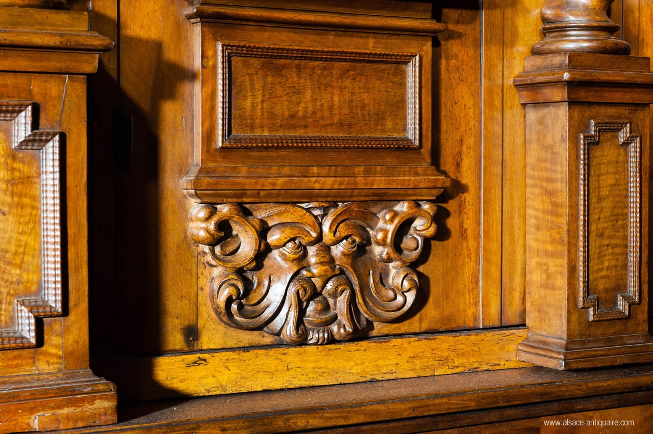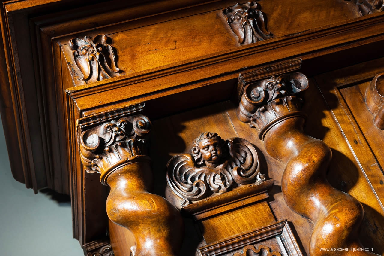 The front side of this wardrobe is composed of 9 twisted columns and the back angles of 2 lateral columns, decorated with ionic capitals decorated with patterns from ludicrous theme. Exceptional ancient Alsatian cabinet whose a copy is presented in the book “L’art du meuble en Alsace” written by Françoise Levy-Coblentz and published in 1975, a reference in the field of Alsatian furniture.