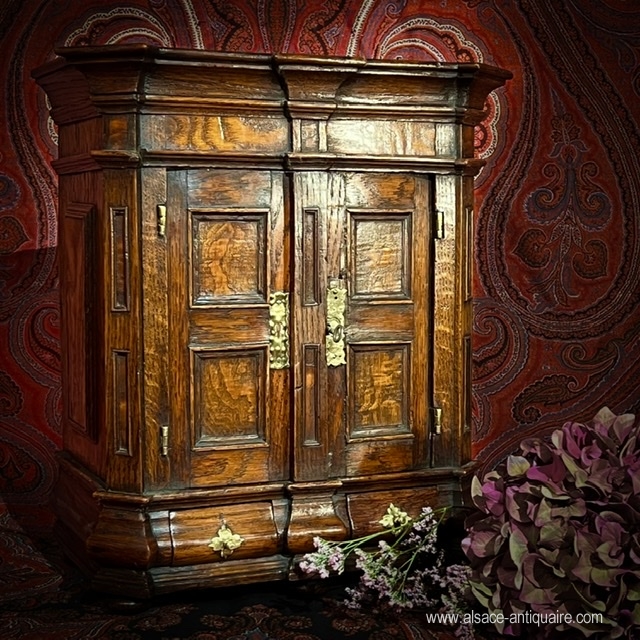 Master's piece of furniture, common name for this miniature furniture, models or sample pieces for the cabinetmaker, this one is the model of a cabinet from the Rhine Valley from the Louis XIV period, beautiful proportions and pretty patina. The cups are in eglomized glass, typical work of Alsatian folk art from the 19th century.