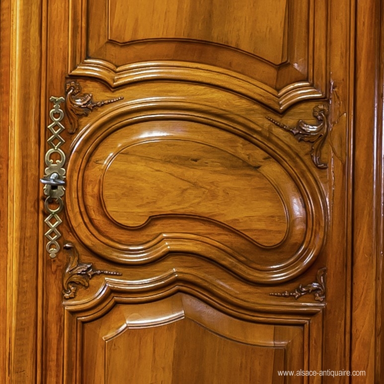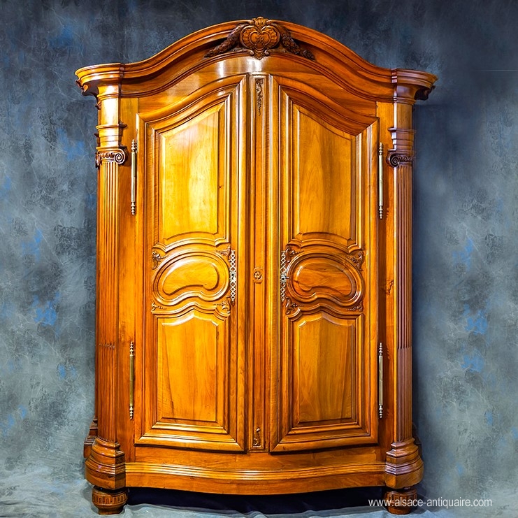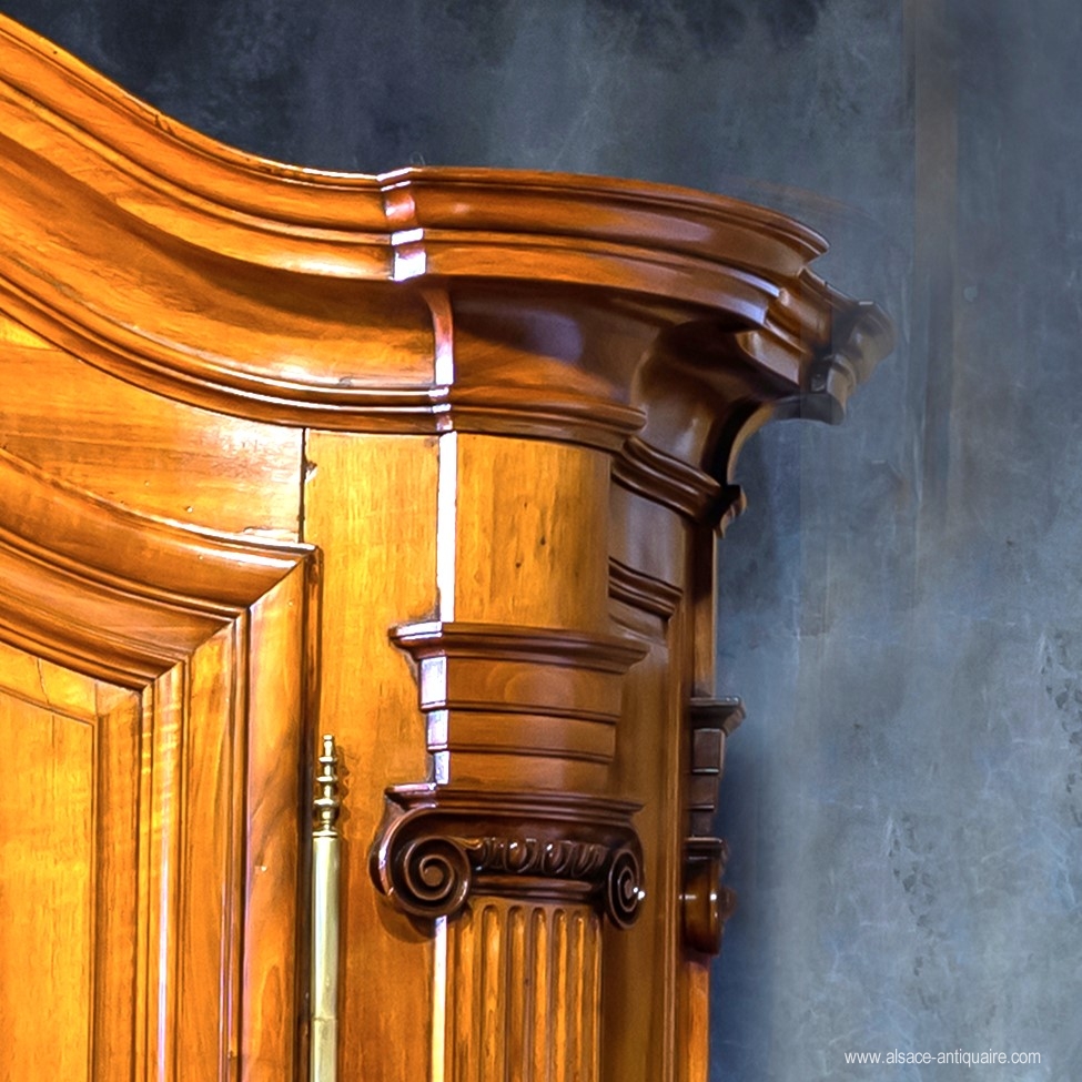 Exceptional walnut quality for this gendarme hat cupboard, curved front and sides. The large fluted corner pilasters, topped with Ionic capitals, recall the design of masterful masterpieces distributed in the 18th century by the corporation of French carpenters in Strasbourg. The pediment is topped with a cartouche flanked by laurel wreaths, in the center of which initials. The motif of the doors is with kidneys, the corner fittings are finely carved with beaded foliage. The sides are paneled, in the center an oval medallion. The feet are top-shaped, typical of the Strasbourg Louis XVI style. Beautiful cremone and period lock. Alsace Strasbourg Epoque XVIII th century.