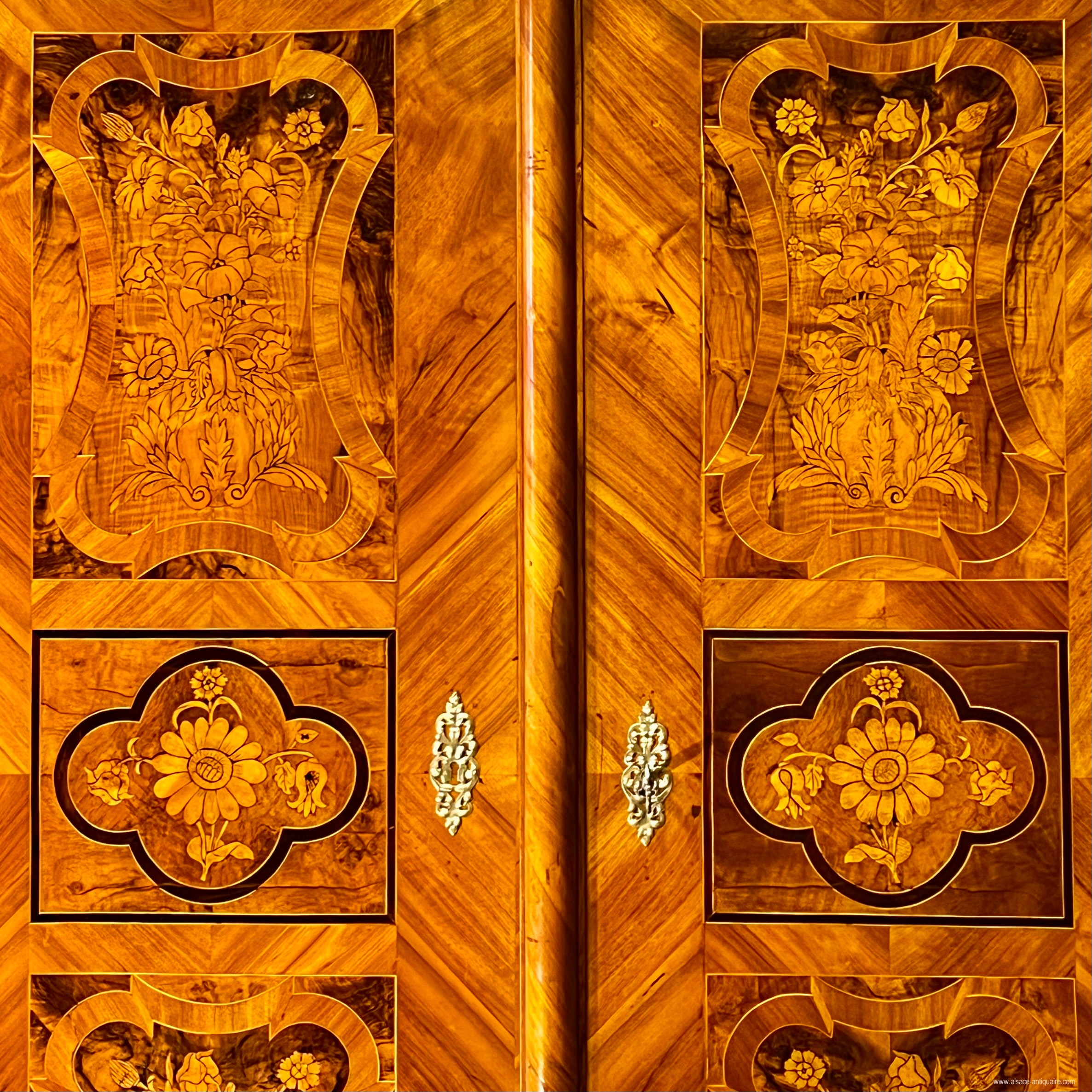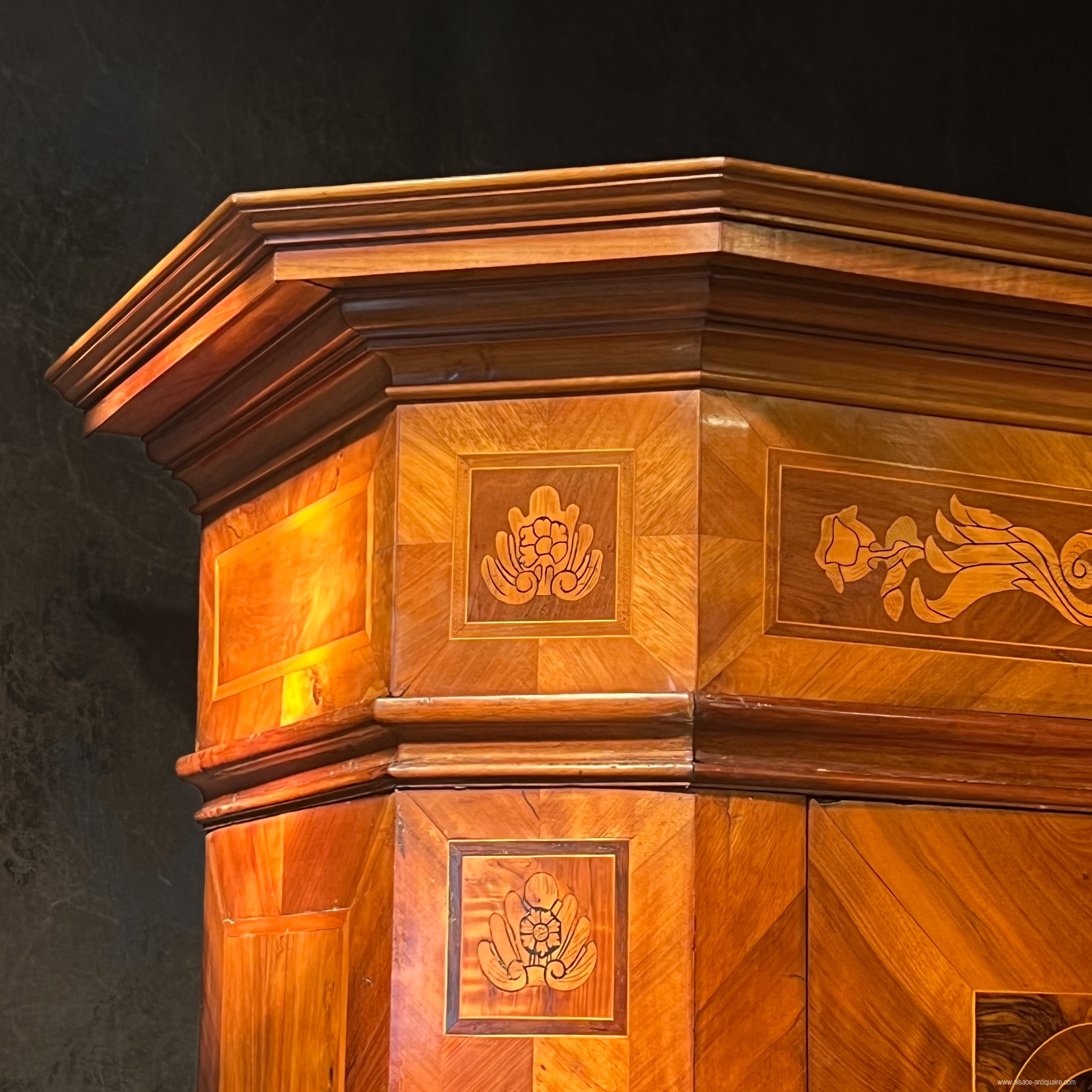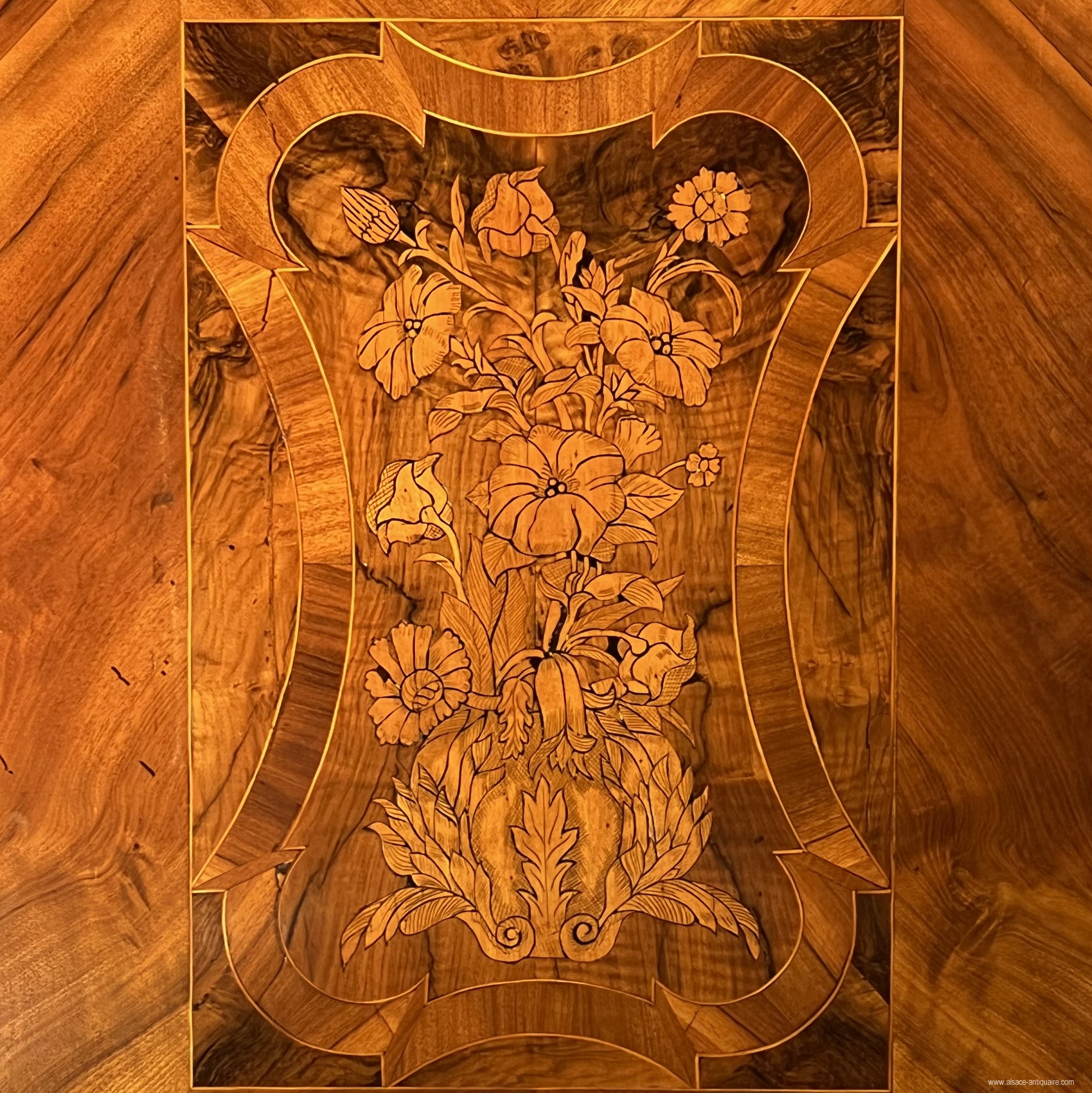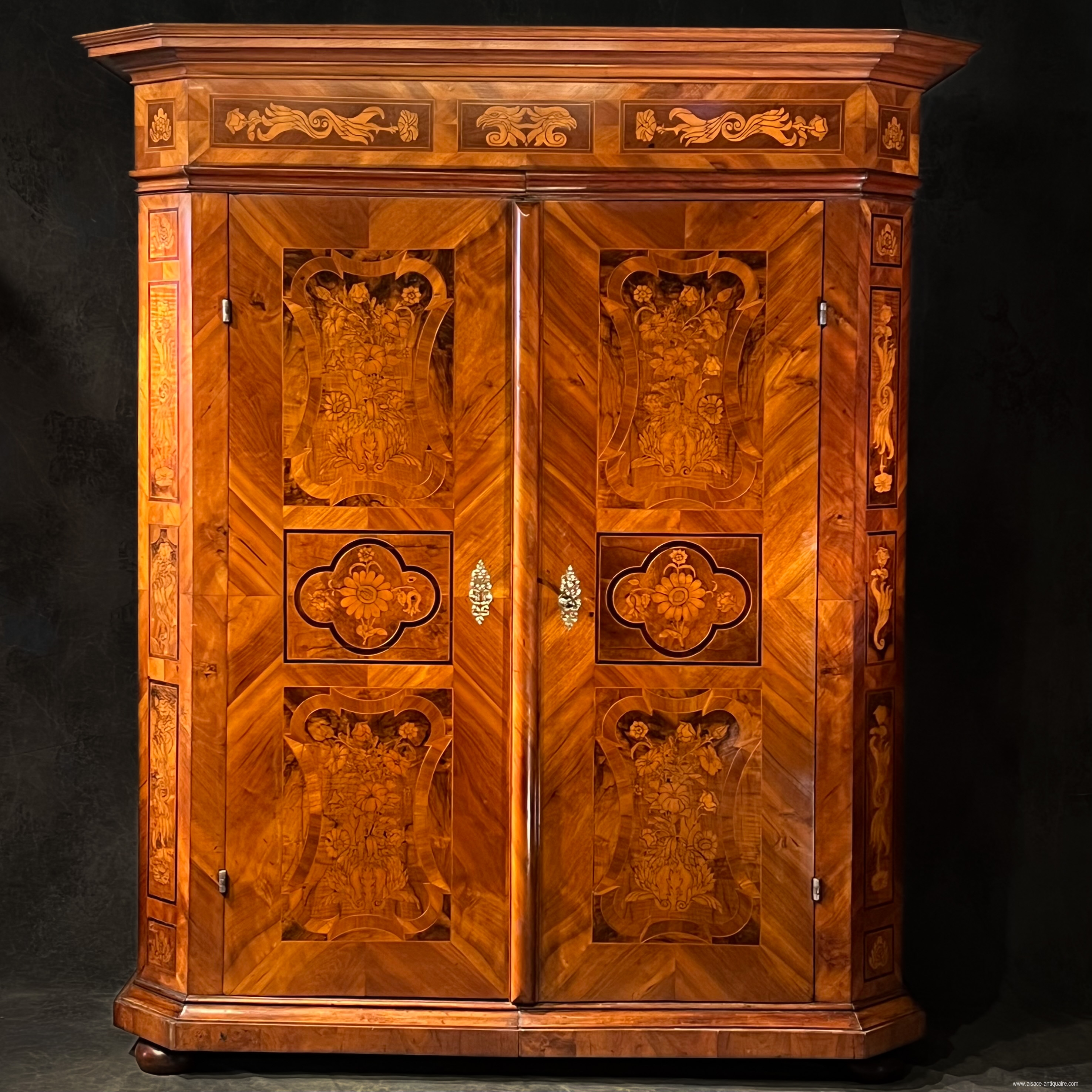 An exceptional ceremonial cabinet, this piece of furniture is dressed in large walnut friezes contoured with alternating strips of light wood, maple, and dark wood, cormier, enclosing reserves inlaid with falling flowers and foliage on the corner pilasters and the upper headband. In the center of the cornice, a cartouche inlaid with a two-headed eagle, an emblem commonly used in heraldry by the noble families of the Habsburg Empire of Austria from the end of the 16th century. The doors are divided into 3 panels, the middle of which has a quadrilobed reserve with a flower inserted in each quarter, the one at the start of the lower lobe develops in the center into a large open button. On either side of this central axis, 4 symmetrical panels delimit, by a large net with a scalloped outline, a space like a simulated flower bed, dressed with a large floral composition with multiple stems. The keyholes are made of brass, decorated with embossed leaves, and opening the doors reveals a magnificent lock and period hinges in iron engraved with scrolls and foliage, the key, also old, is surmounted by a heart on the top of the ring, perhaps it is a wedding armoire. The design of this cabinet is typical of the techniques used in the Rhineland, Switzerland and the Holy Roman Empire: the architecture is with cut sides simulating corner pilasters, the frame is made of softwood covered with a thick veneer, here walnut , the piece of furniture is made up of three pieces in addition to the doors, the two volumes of the central body are assembled together by large wooden wedges, the whole is topped with a removable cornice, the doors are fixed on the frame by With important engraved iron hinges, an old technique used since the Renaissance in these countries, the piece of furniture is placed on the ground by flat feet. 18th century period restorations for use and maintenance - overall dimensions at the cornice L190 x D68 x H221 cm We can offer personalized delivery, contact us for a quote.