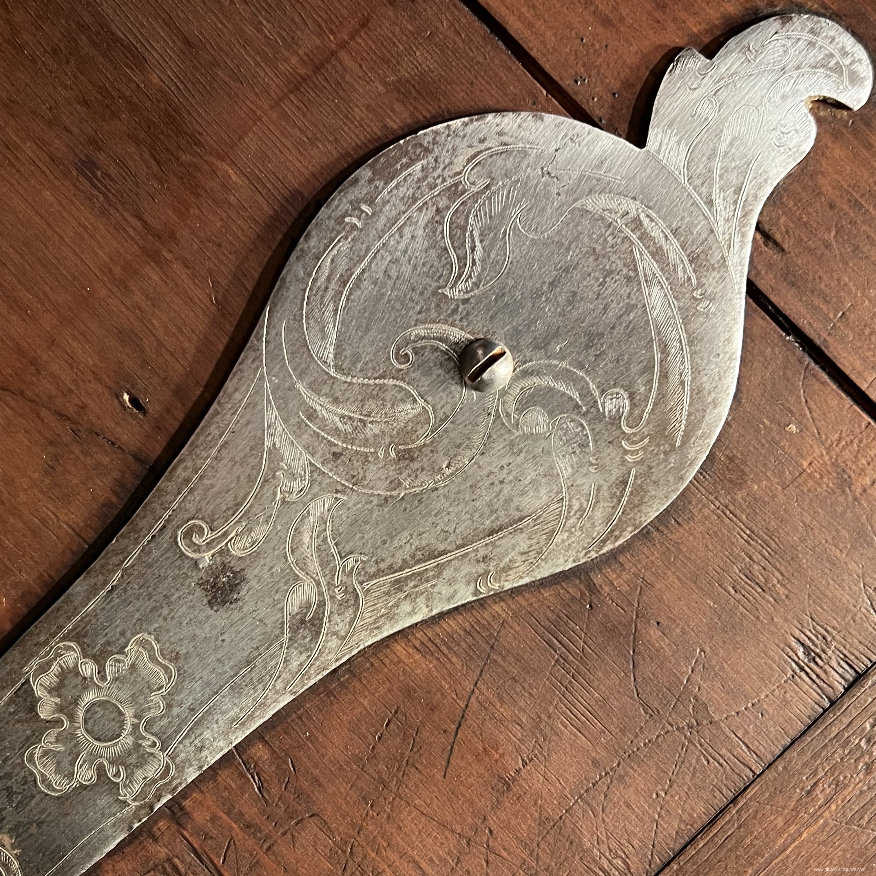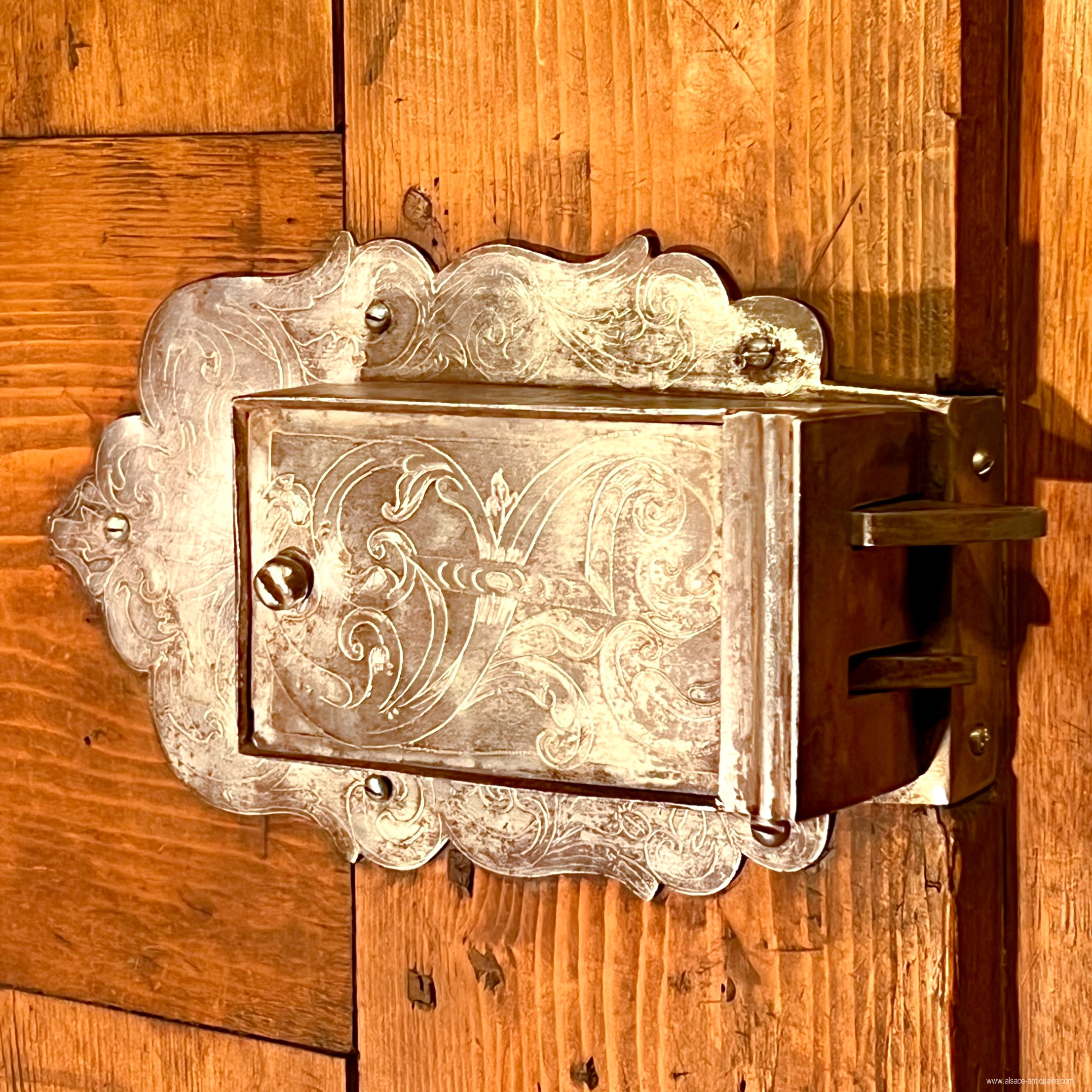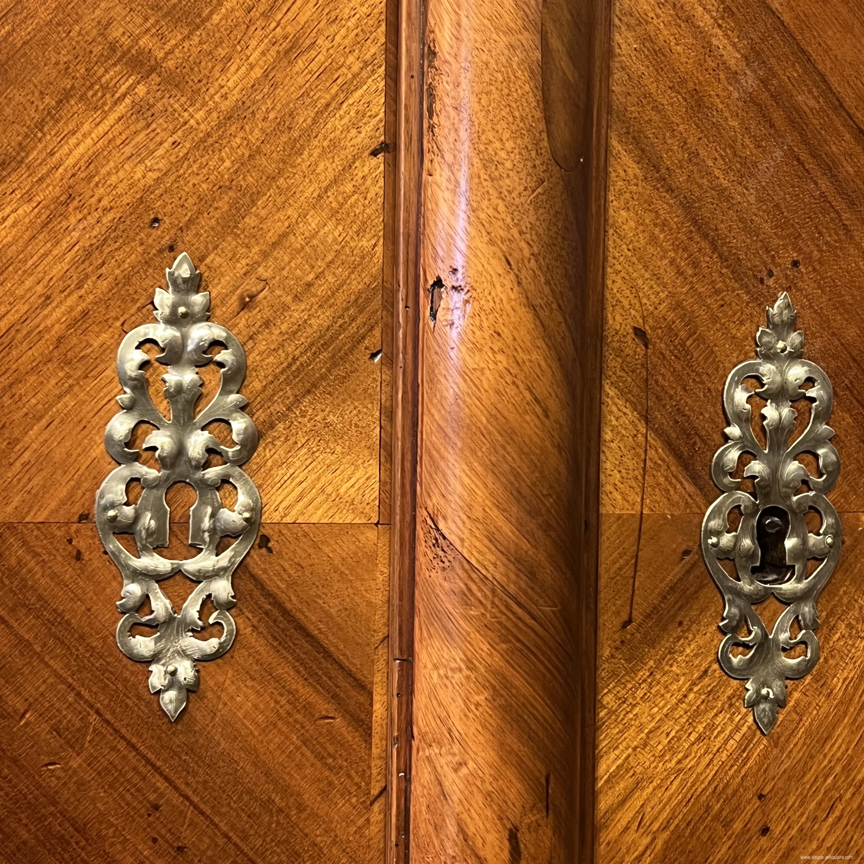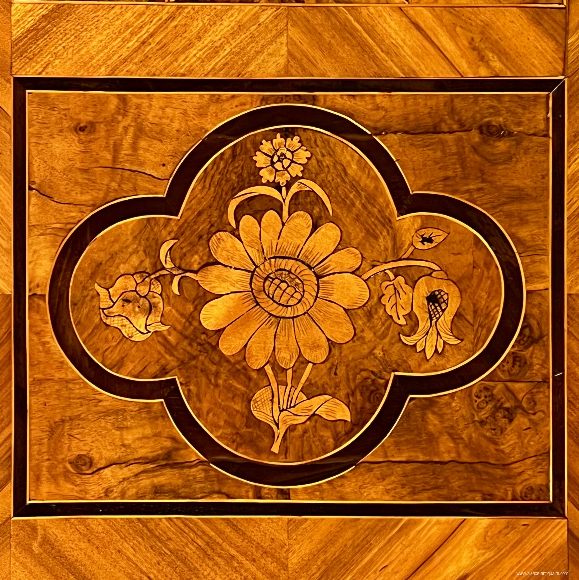 An exceptional ceremonial cabinet, this piece of furniture is dressed in large walnut friezes contoured with alternating strips of light wood, maple, and dark wood, cormier, enclosing reserves inlaid with falling flowers and foliage on the corner pilasters and the upper headband. In the center of the cornice, a cartouche inlaid with a two-headed eagle, an emblem commonly used in heraldry by the noble families of the Habsburg Empire of Austria from the end of the 16th century. The doors are divided into 3 panels, the middle of which has a quadrilobed reserve with a flower inserted in each quarter, the one at the start of the lower lobe develops in the center into a large open button. On either side of this central axis, 4 symmetrical panels delimit, by a large net with a scalloped outline, a space like a simulated flower bed, dressed with a large floral composition with multiple stems. The keyholes are made of brass, decorated with embossed leaves, and opening the doors reveals a magnificent lock and period hinges in iron engraved with scrolls and foliage, the key, also old, is surmounted by a heart on the top of the ring, perhaps it is a wedding armoire. The design of this cabinet is typical of the techniques used in the Rhineland, Switzerland and the Holy Roman Empire: the architecture is with cut sides simulating corner pilasters, the frame is made of softwood covered with a thick veneer, here walnut , the piece of furniture is made up of three pieces in addition to the doors, the two volumes of the central body are assembled together by large wooden wedges, the whole is topped with a removable cornice, the doors are fixed on the frame by With important engraved iron hinges, an old technique used since the Renaissance in these countries, the piece of furniture is placed on the ground by flat feet. 18th century period restorations for use and maintenance - overall dimensions at the cornice L190 x D68 x H221 cm We can offer personalized delivery, contact us for a quote.